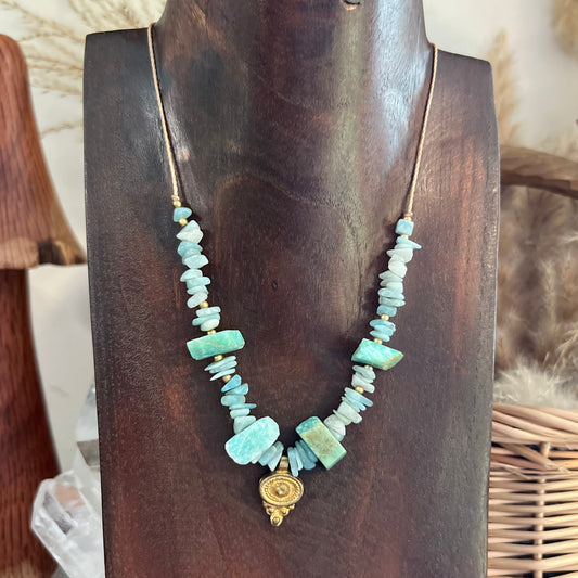 Amazonite & Dyed Agate with Brass charm Layer Crystal Necklace: