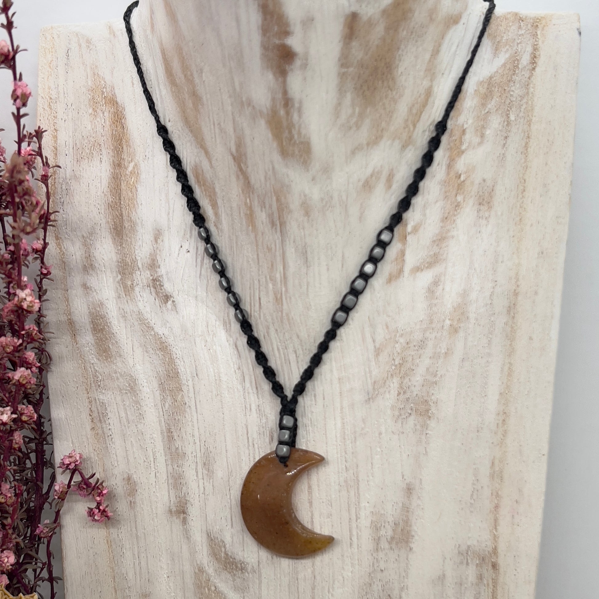 This crescent moon necklace has been woven from natural orange toned Agate and features silver aura Hematite beading.