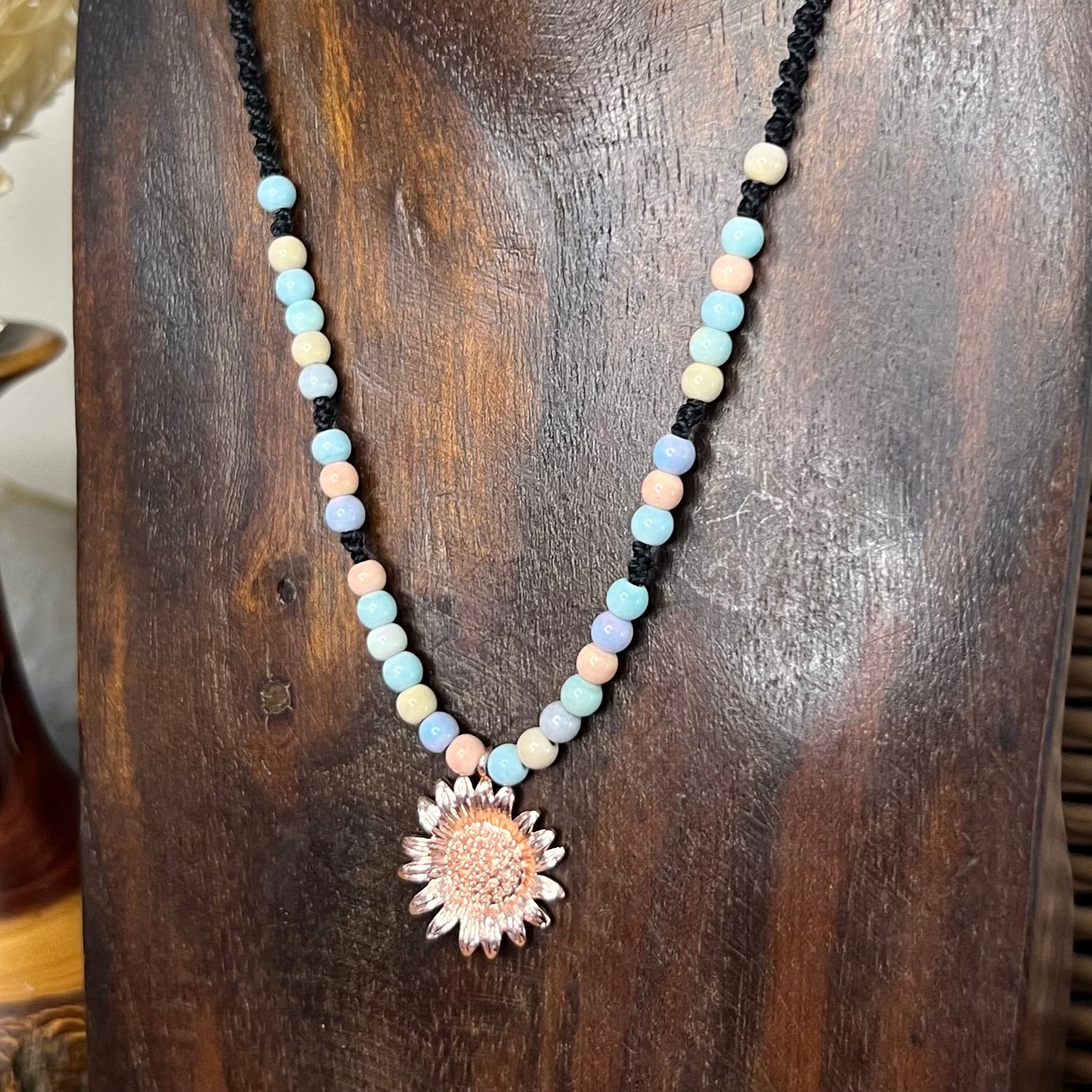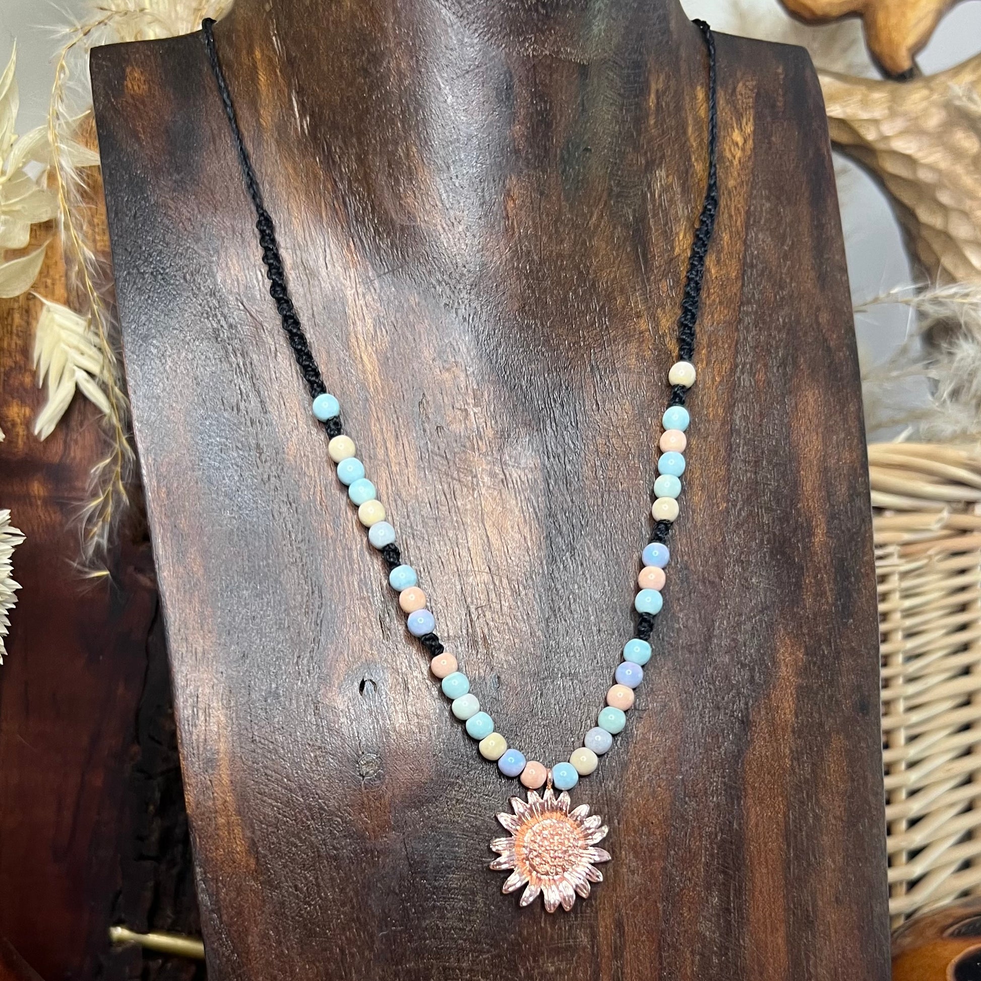 Soft and soothing Alashan Agate beads are paired beautifully with a radiant rose gold sunflower pendant, creating a necklace that’s both uplifting and elegant. Handwoven on a sleek 0.5mm black Linhasita cord, this layered piece adds a gentle, happy glow to any outfit.