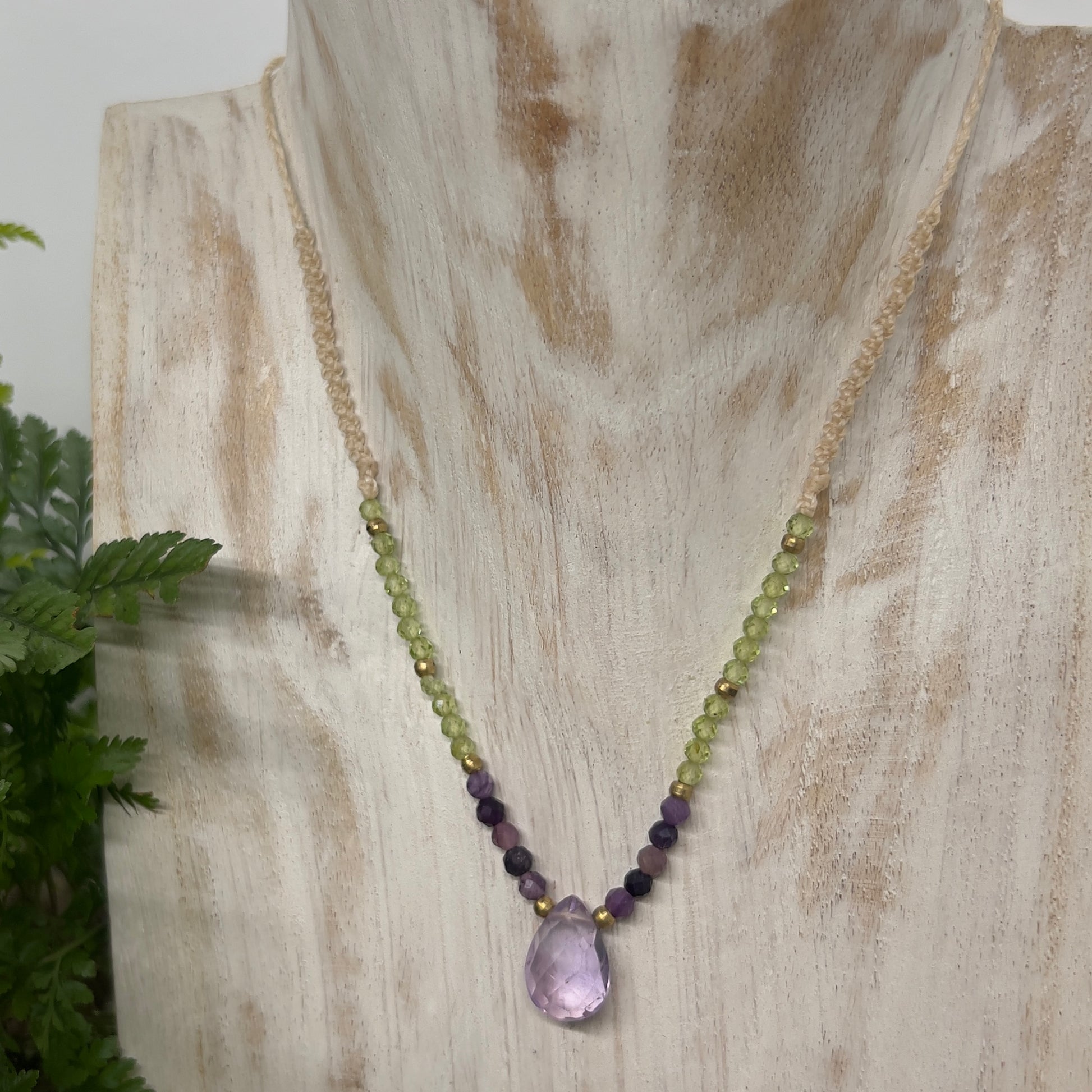 Materials: Linhasita Cord, Amethyst, Peridot, Brass