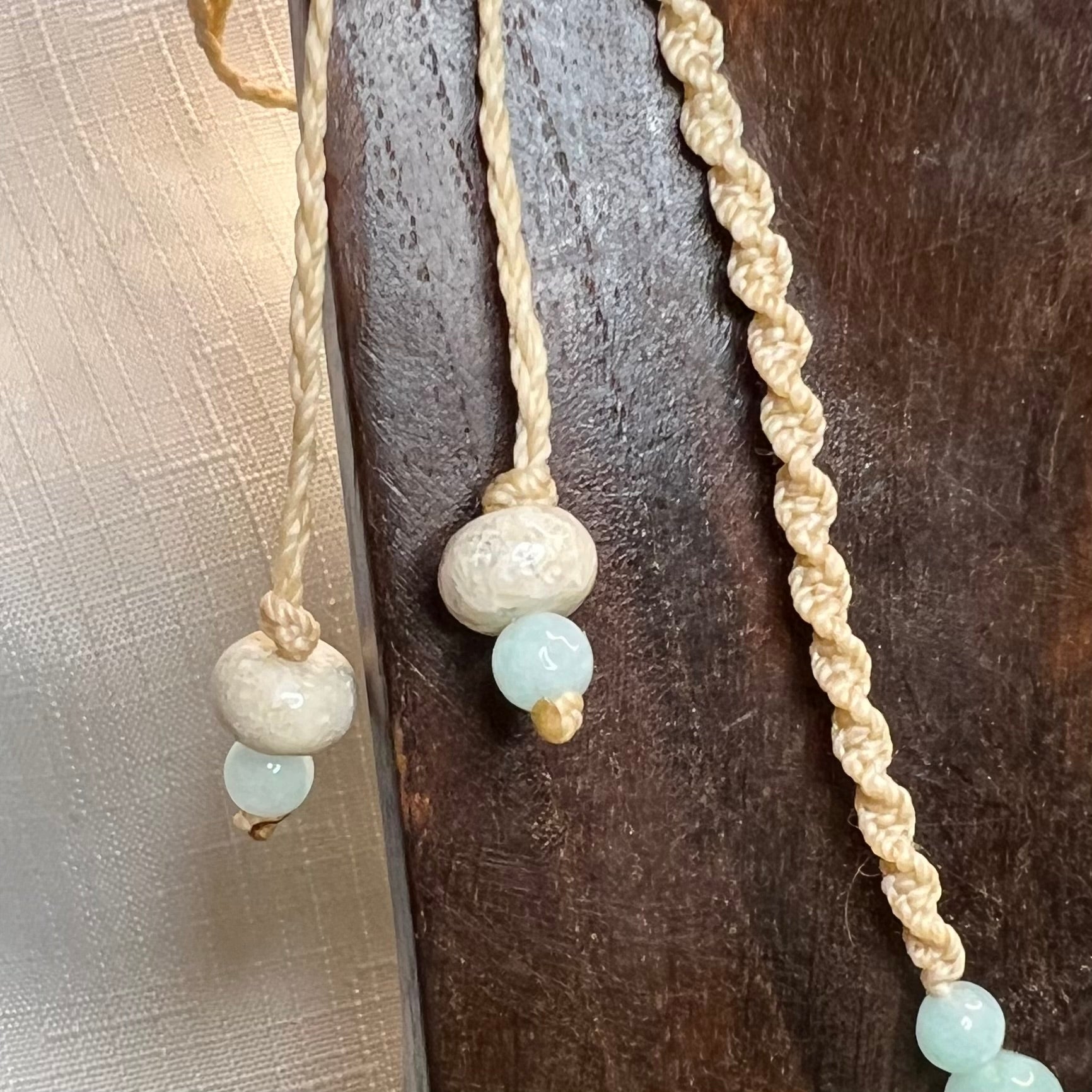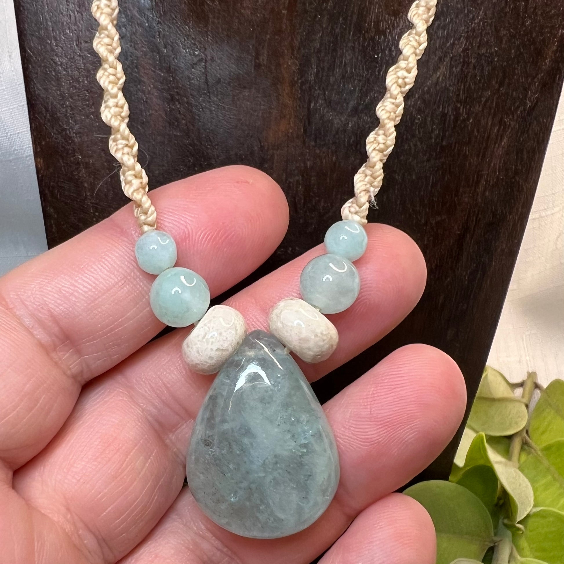 Woven on 1mm Cream Linhasita cord, the gorgeous and calming tones of those necklace are magic. From the soothing and incredible (chunky) Aquamarine pendant to the chosen beading combination, everything about this necklace brings soothing energy.