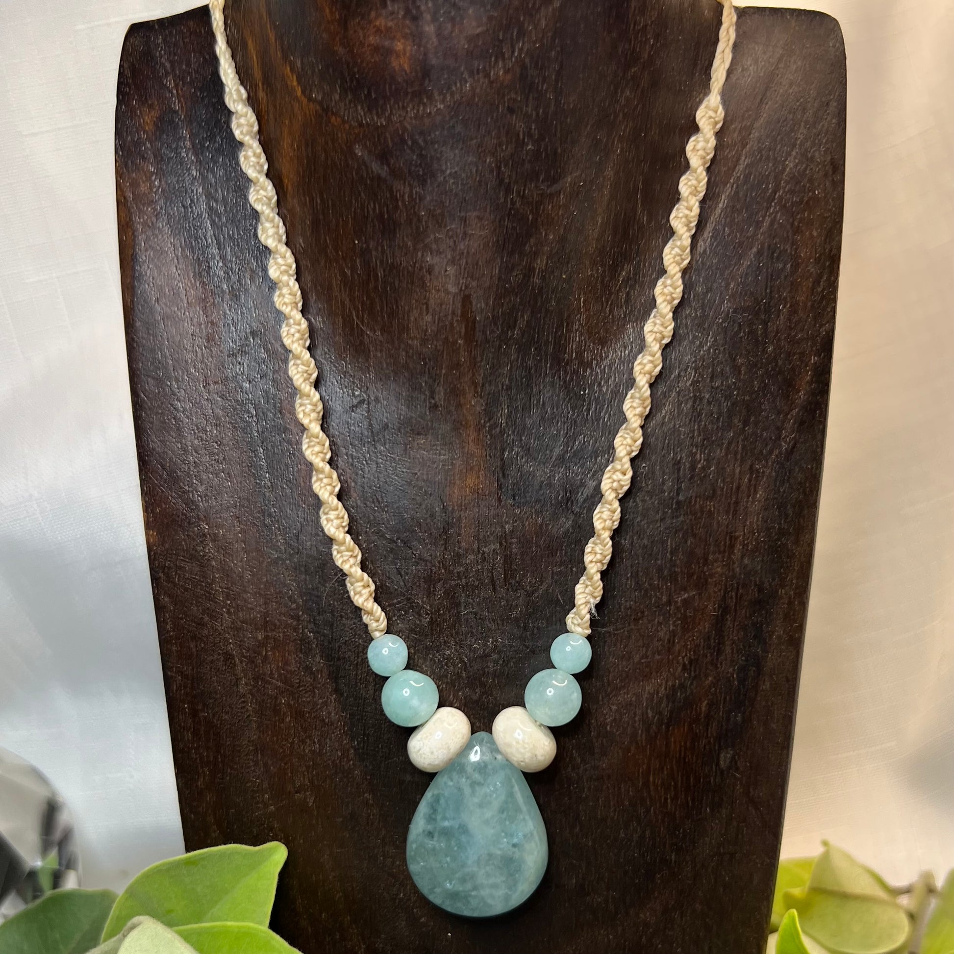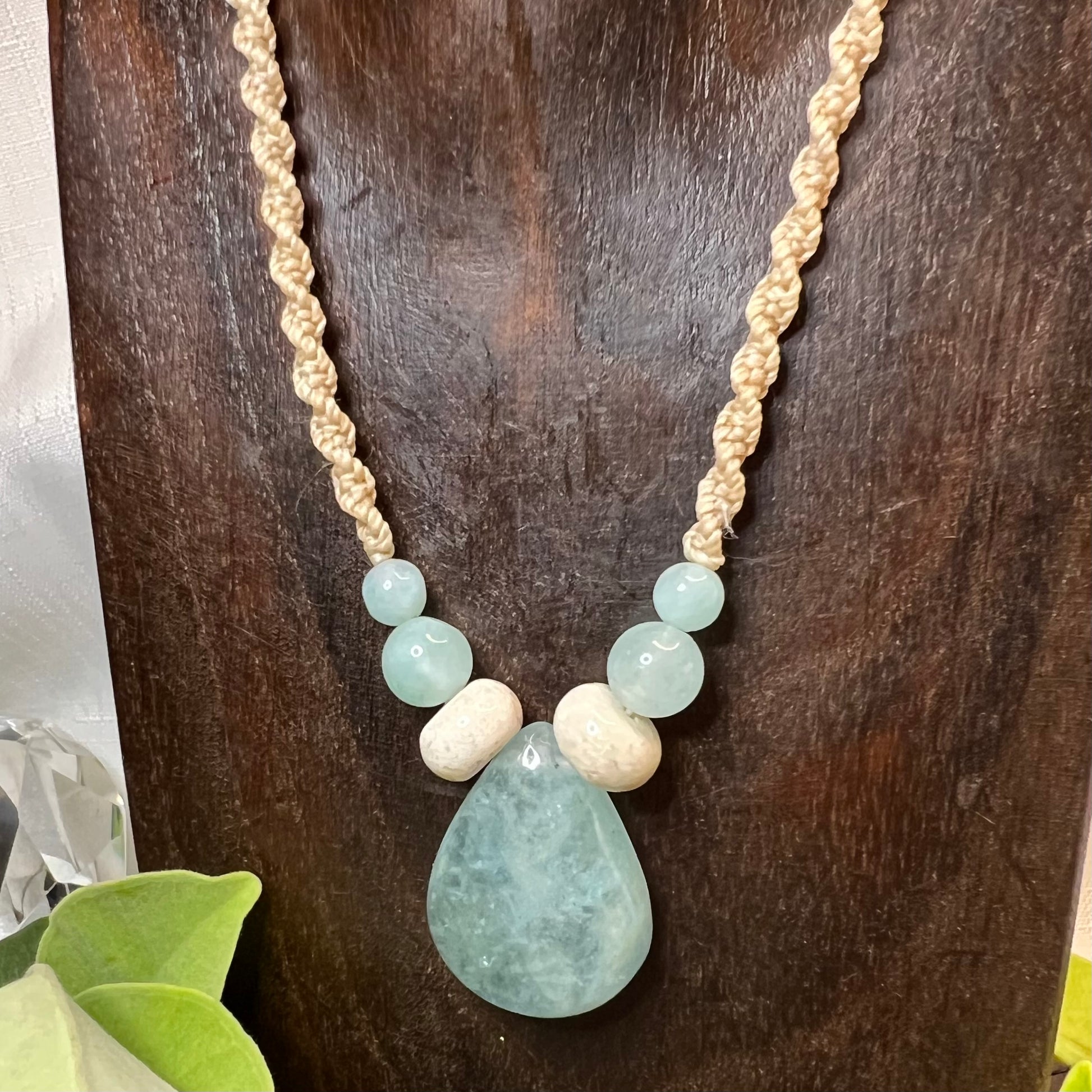 Aquamarine and Fossil Bone Macrame Crystal Necklace