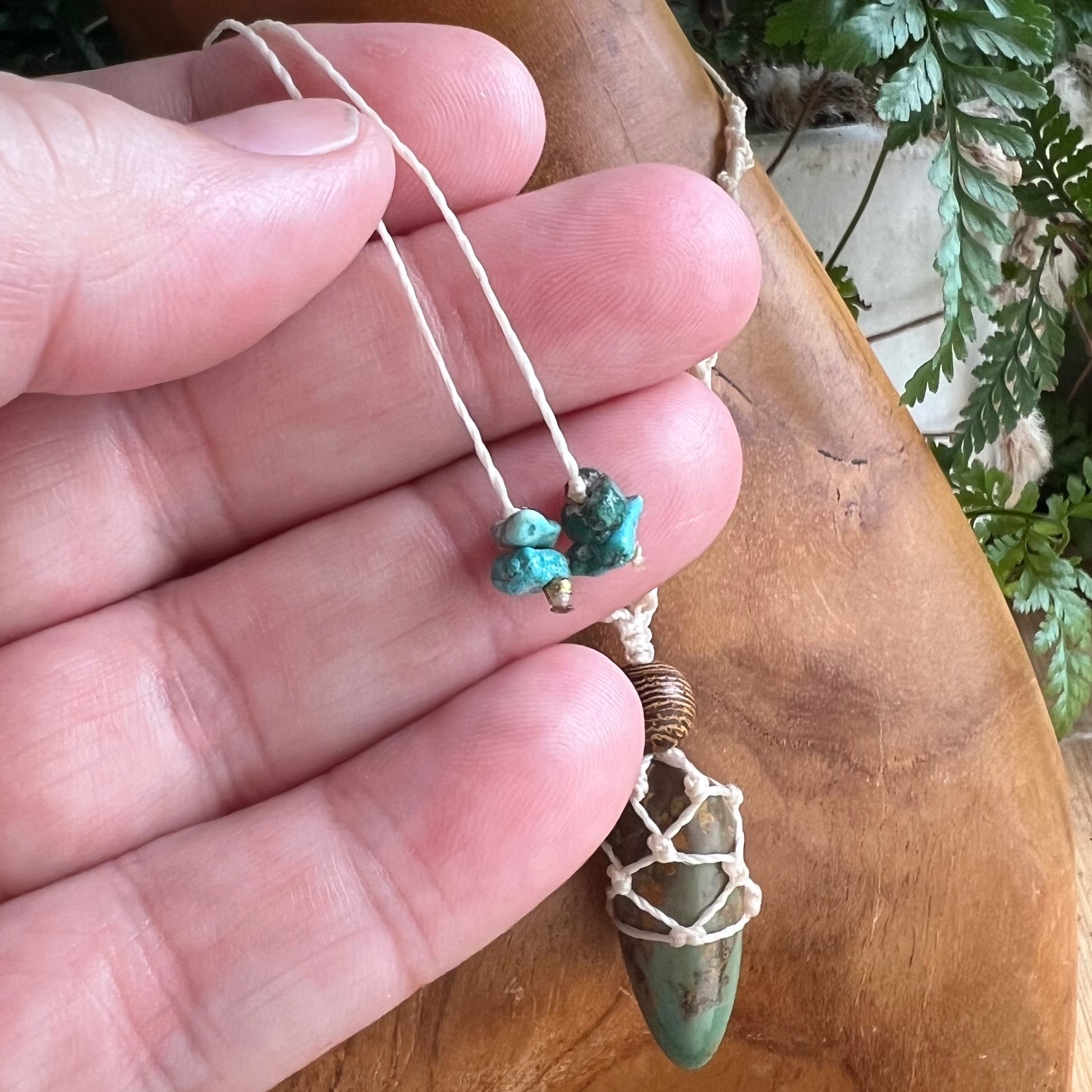 Polished free-form Arizona Turquoise with polished wood in a petite macrame basket woven from .5 mm cream Linhasita cord.