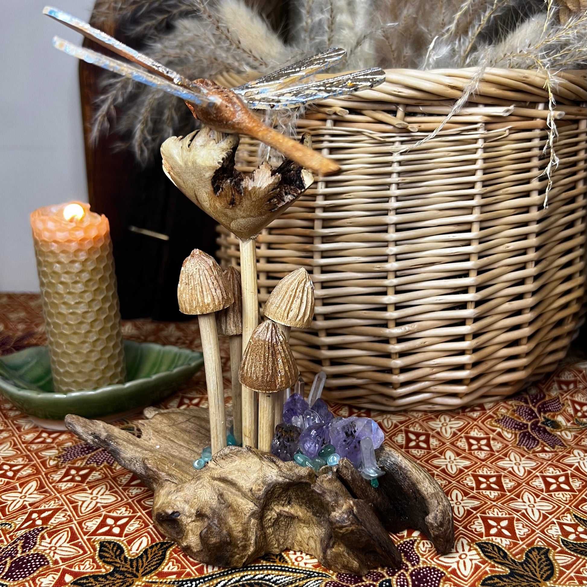 Bespoke Crystal & Wooden Burl Mushroom & Dragonfly Display