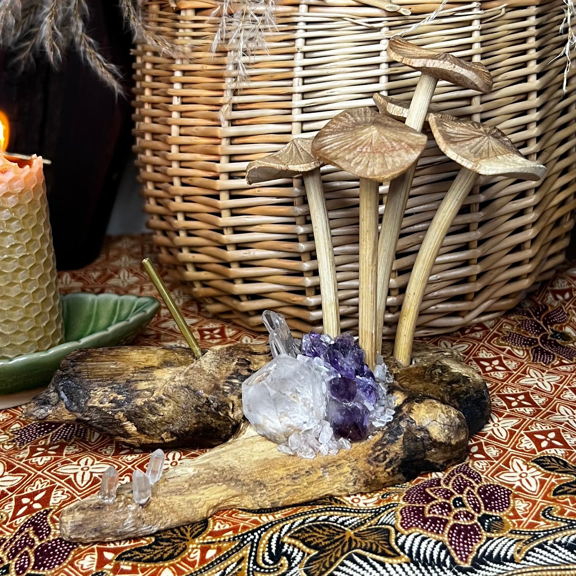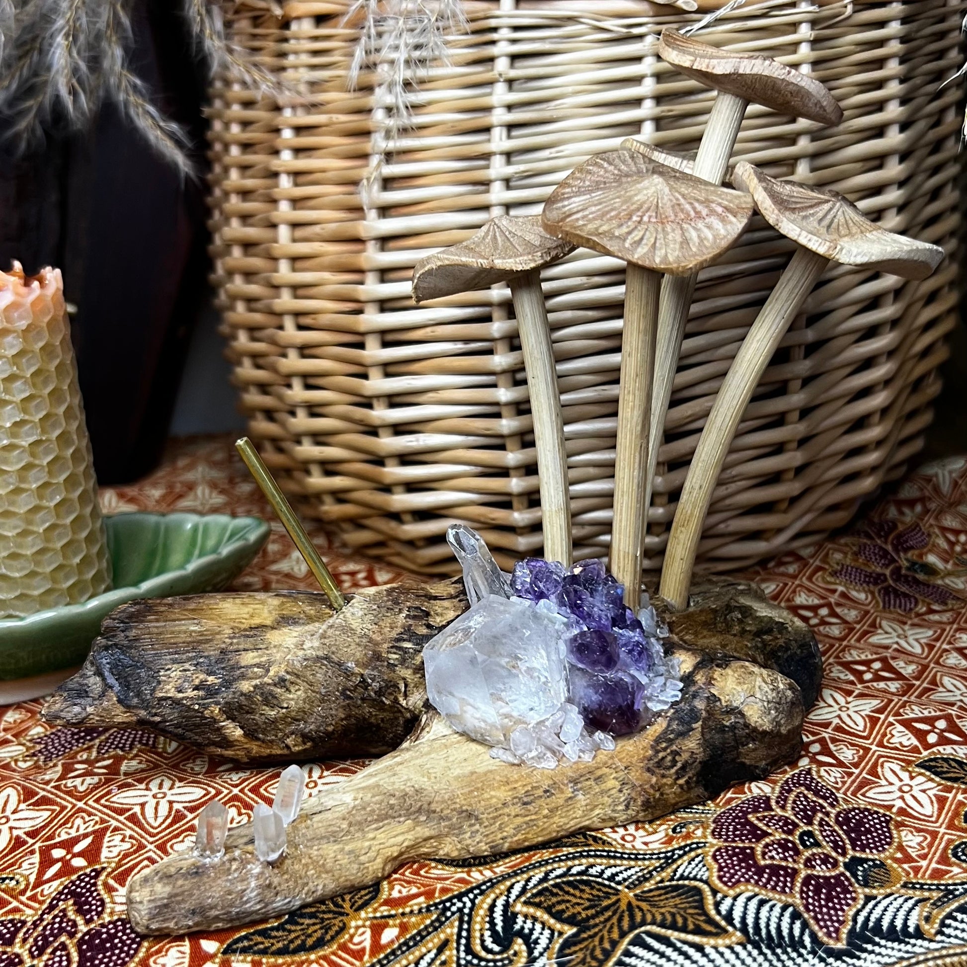 Bespoke Crystal & Wooden Burl Mushroom Incense Stick Holder - Amethyst | Quartz | Rose Quartz