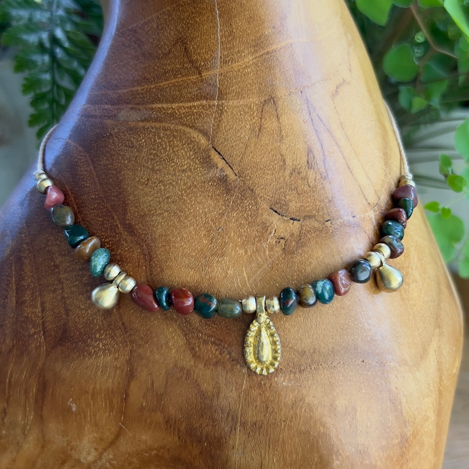 An earthy panel of beautifully polished irregular Bloodstone beads, accompanied by high-quality Brass beads and charms on 1mm Sand toned Linhasita cording.