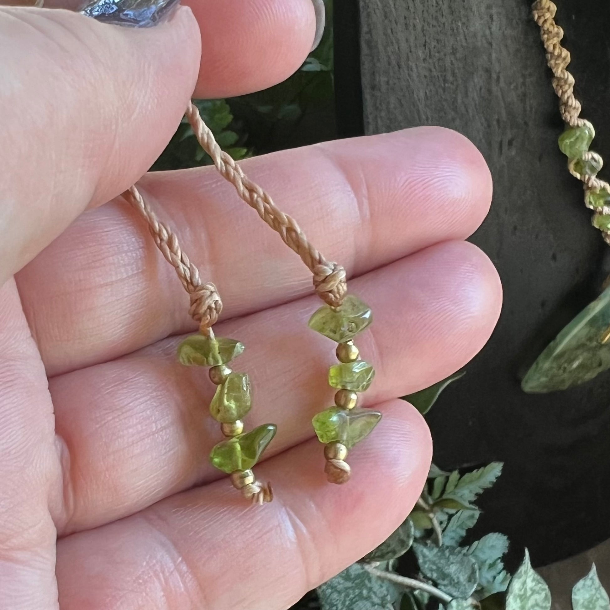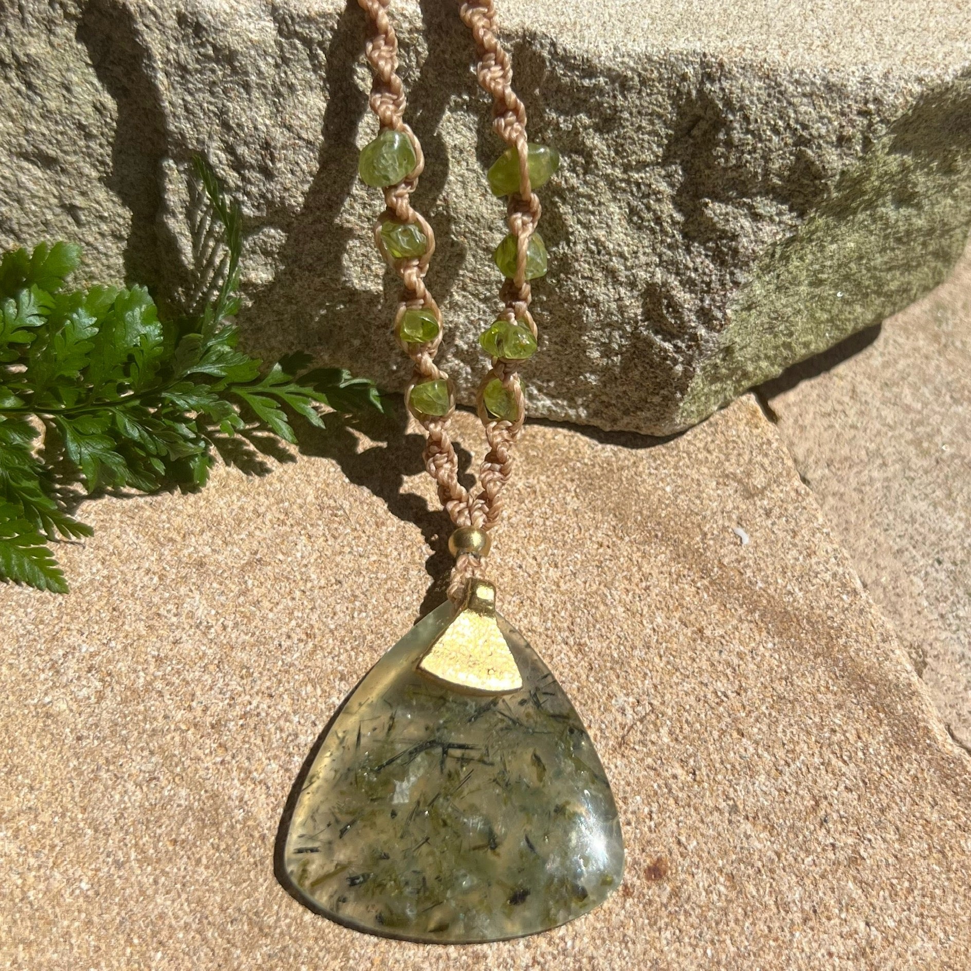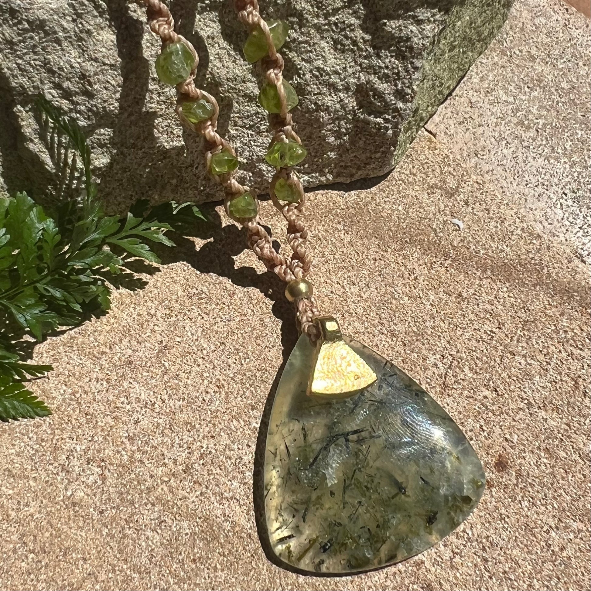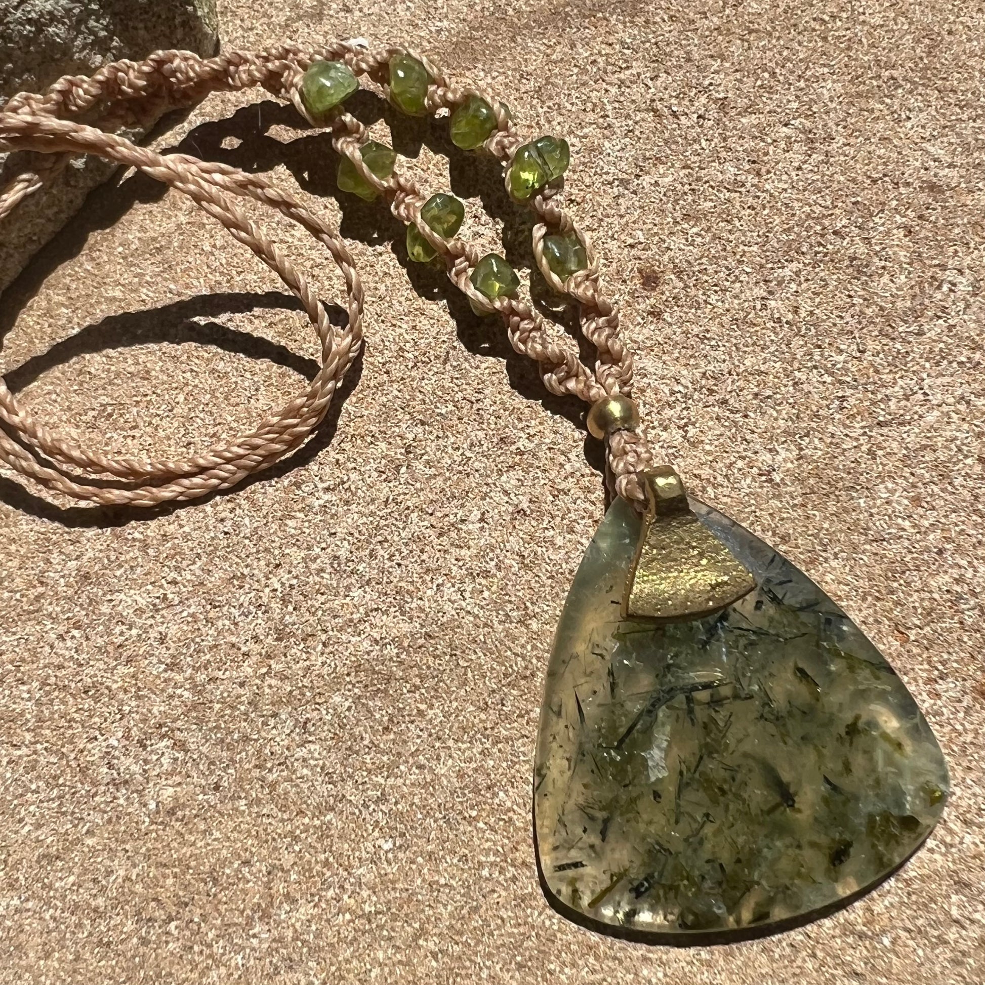 Materials: Linhasita Cord, Prehnite with Epidote, Peridot, Brass