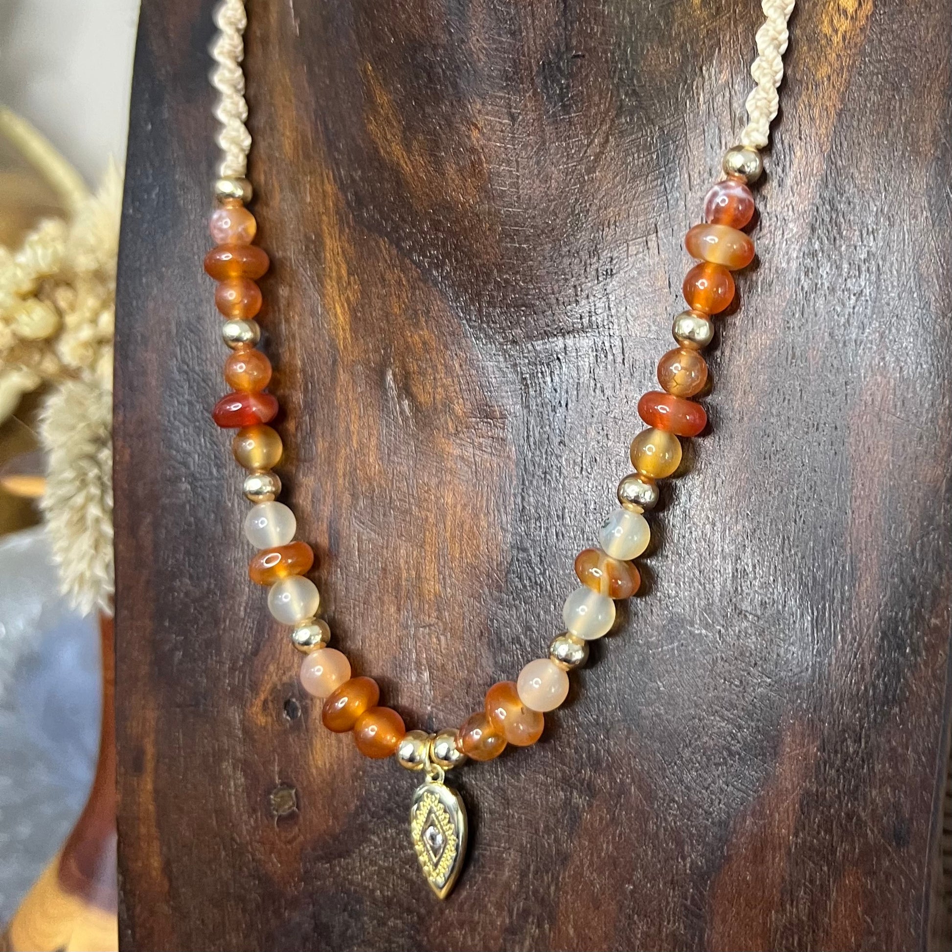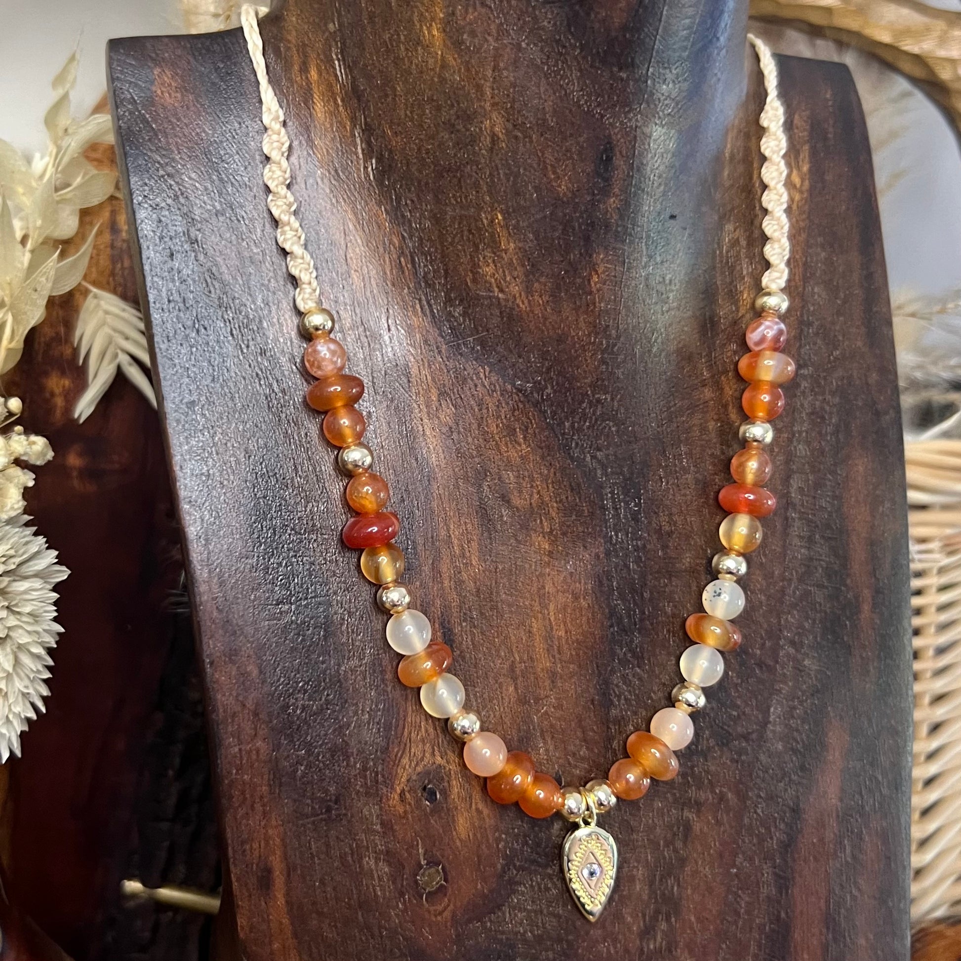 Ignite your energy with this fiery necklace, featuring the rich warmth of deep-toned Carnelian and Persian Gulf Agate beads. Accented by tarnish-resistant gold beads and charm, this piece is handwoven on durable 1mm sand-tone Brazilian Linhasita cord, blending boho spirit with elegant shine.