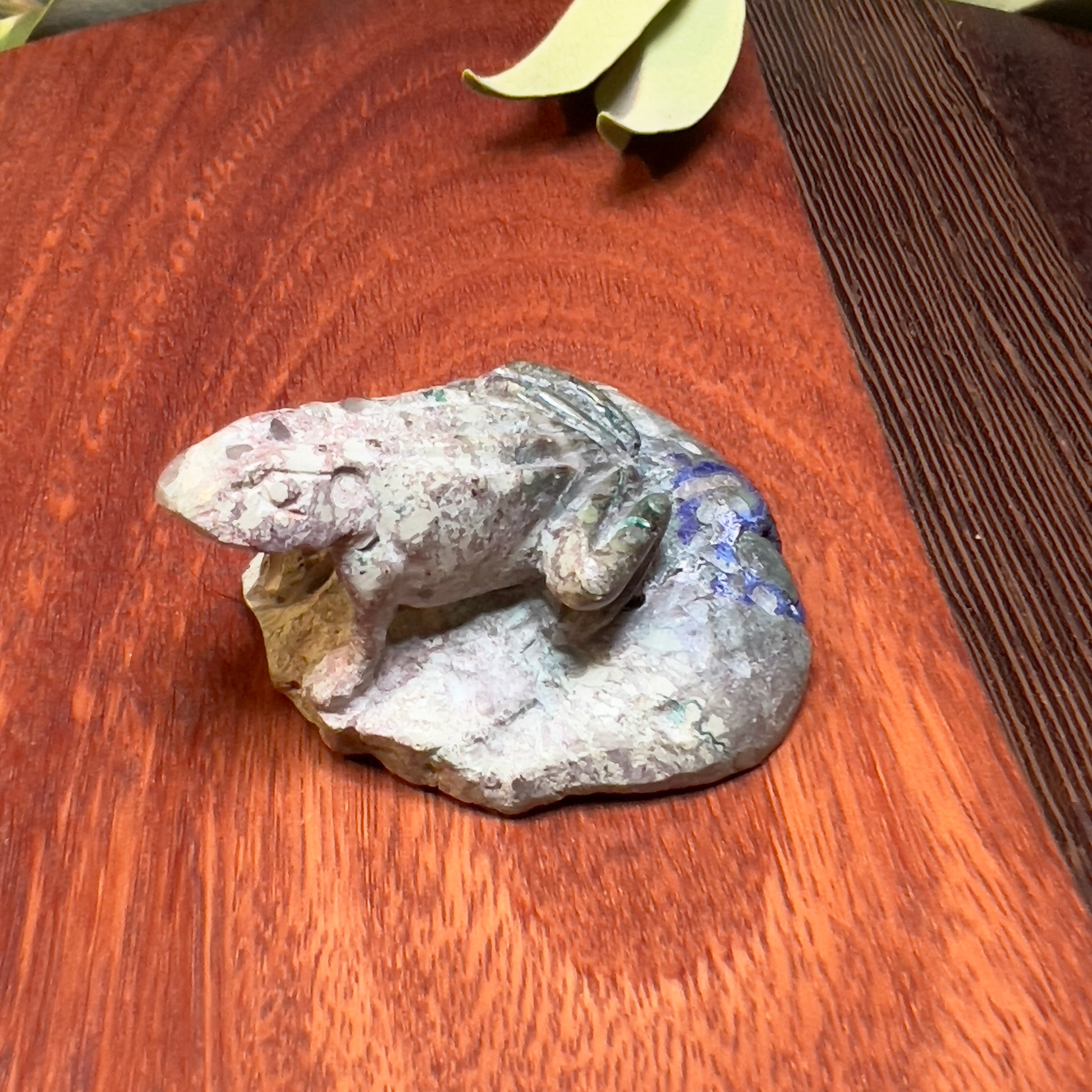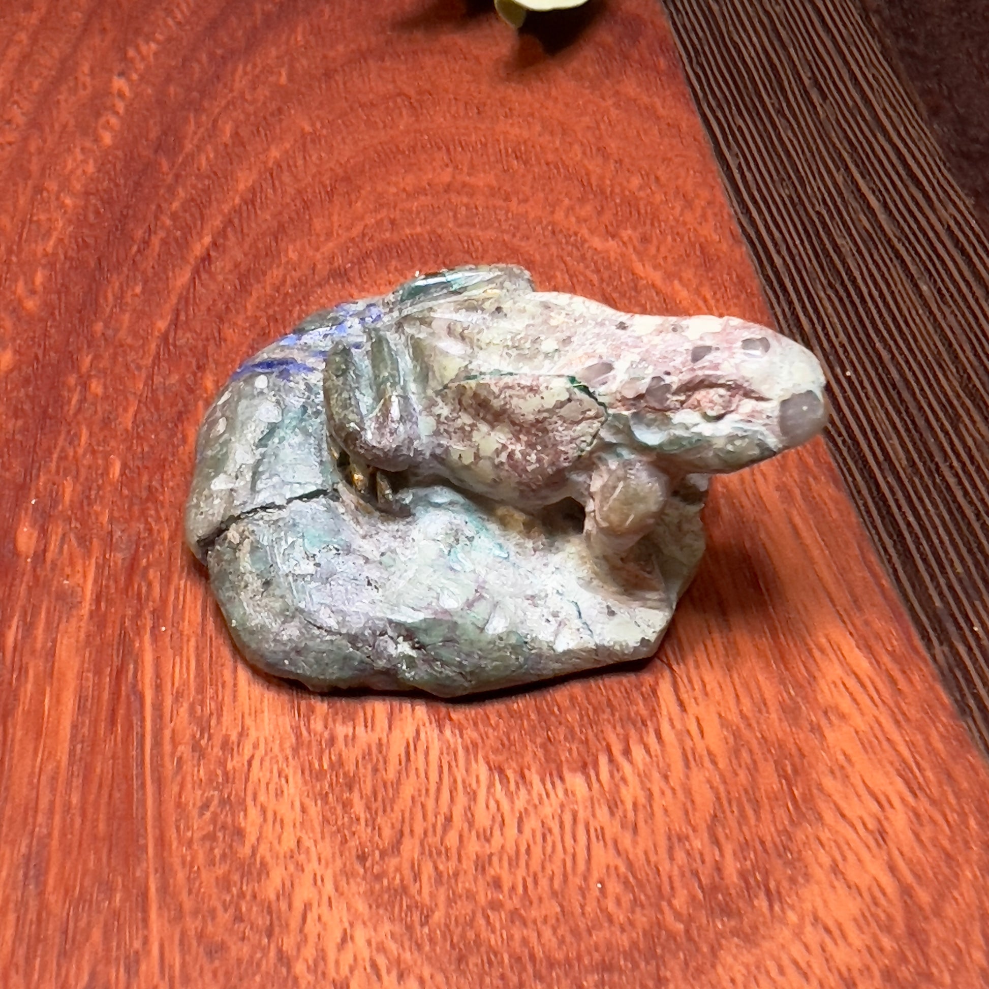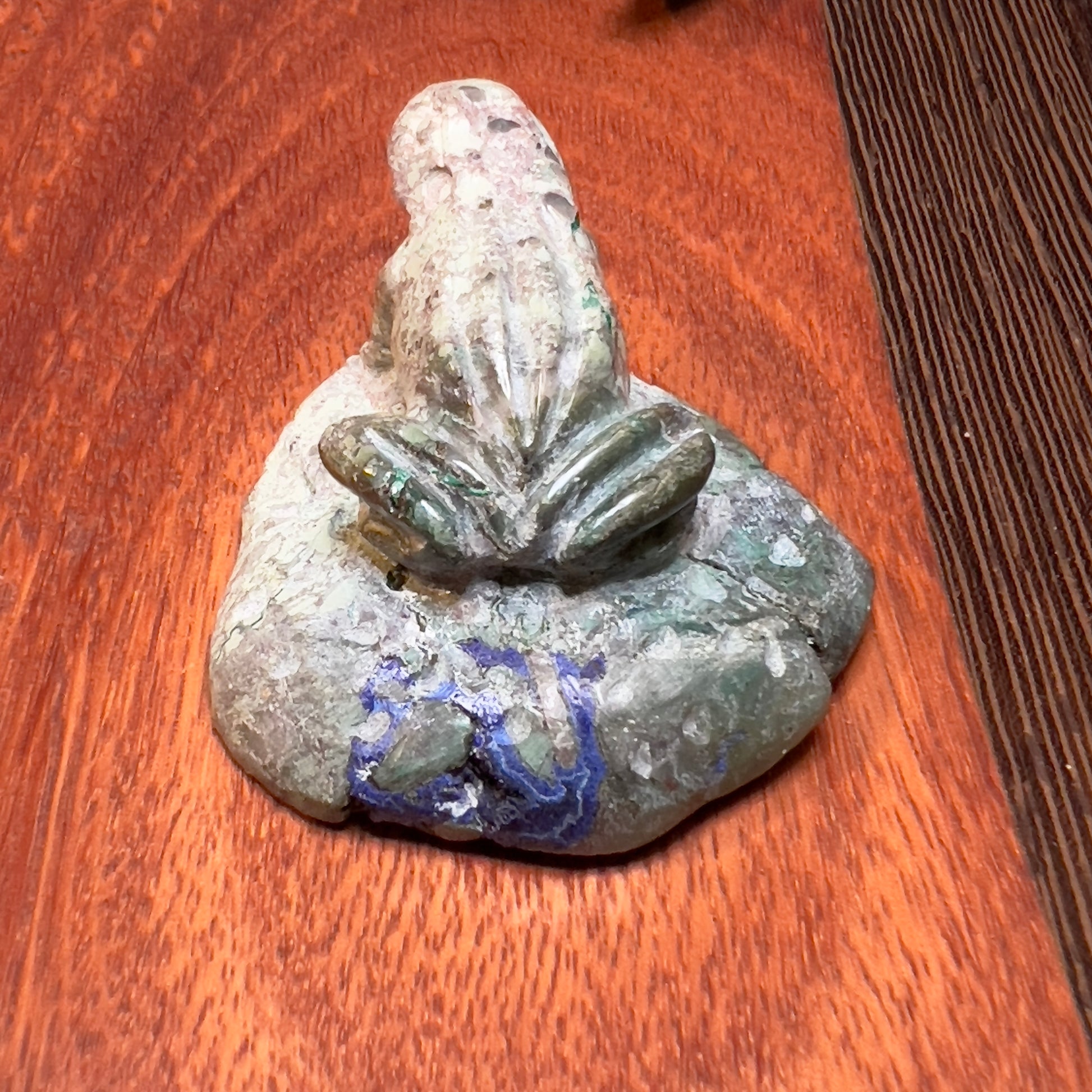 Azurite/Malachite in matrix Carved Frog Statue, rustic and charming.