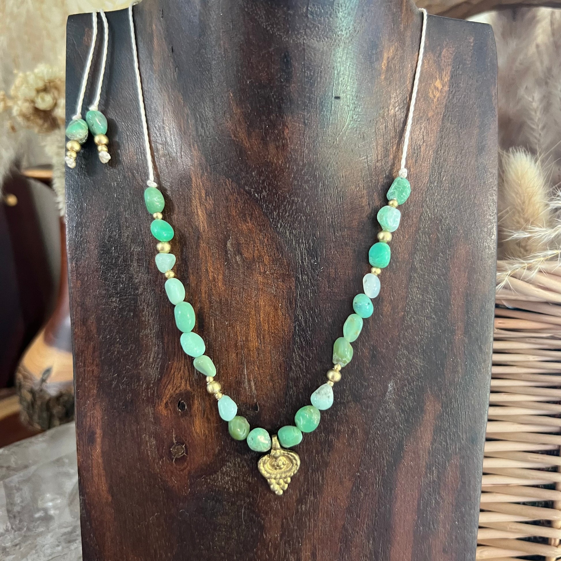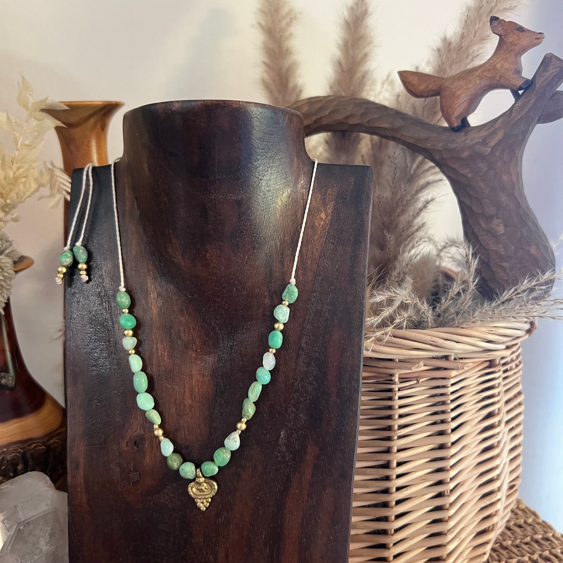 A lush necklace featuring beautifully polished, irregular Chrysoprase beads known for their vibrant, fresh green tones. Complemented by high-quality brass beads and delicate brass charms, this piece is strung on a 1mm sand-tone Linhasita cord, blending natural elegance with a warm metallic glow.