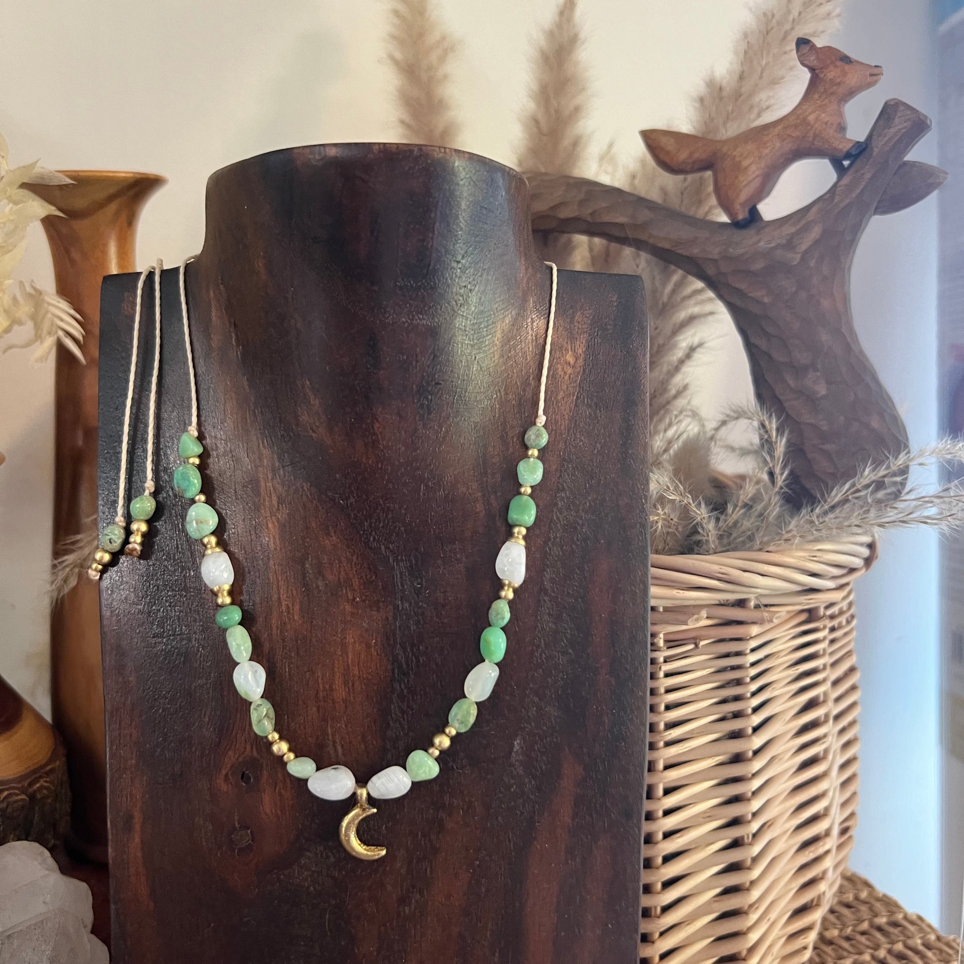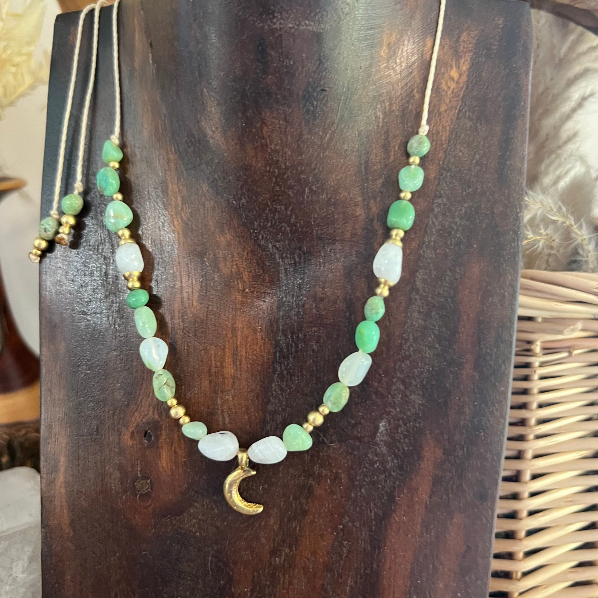 Chrysoprase with Rainbow Moonstone and Brass charm Crystal Necklace