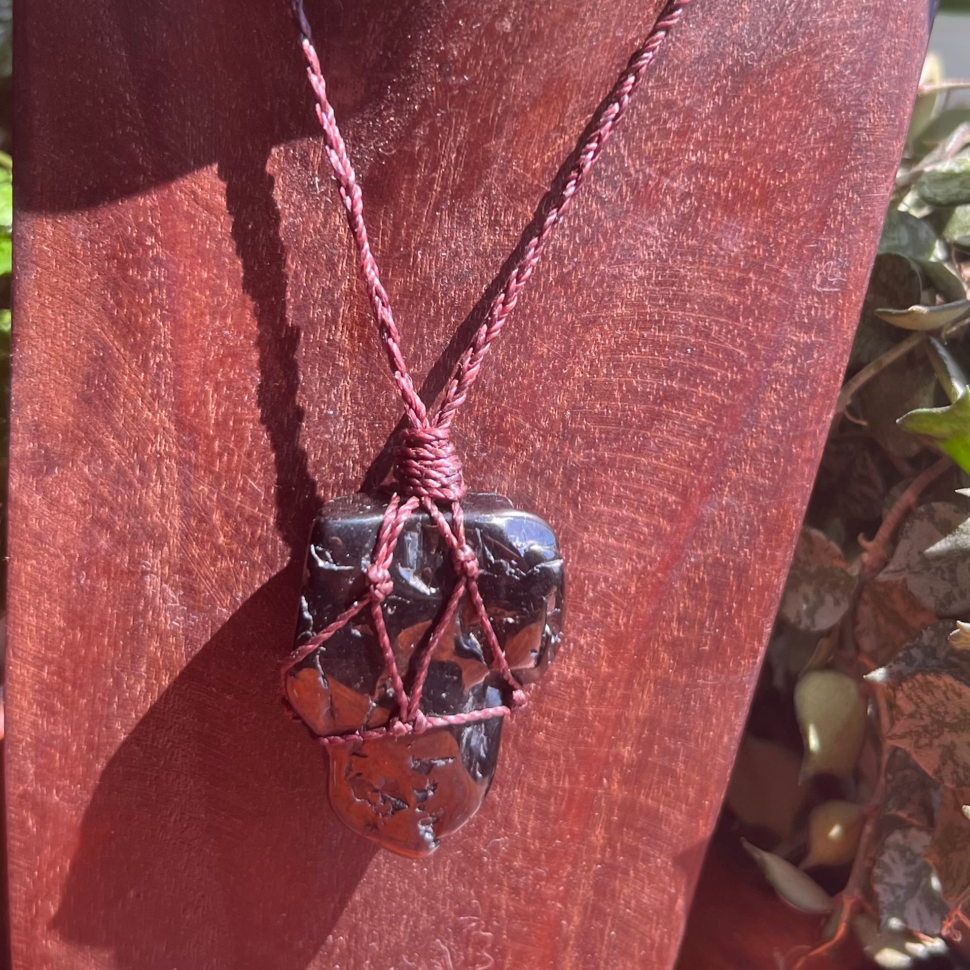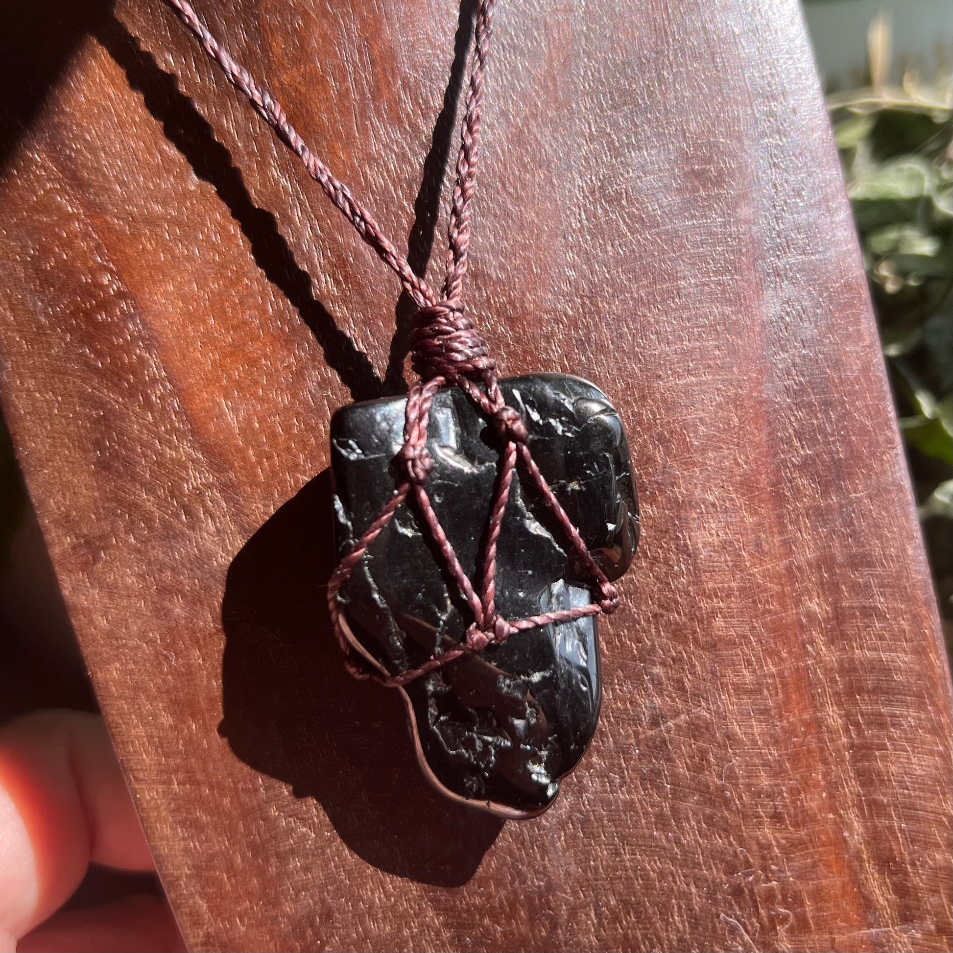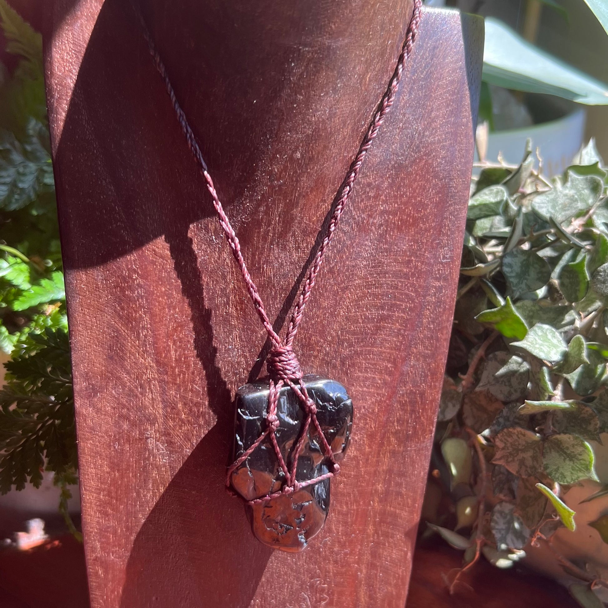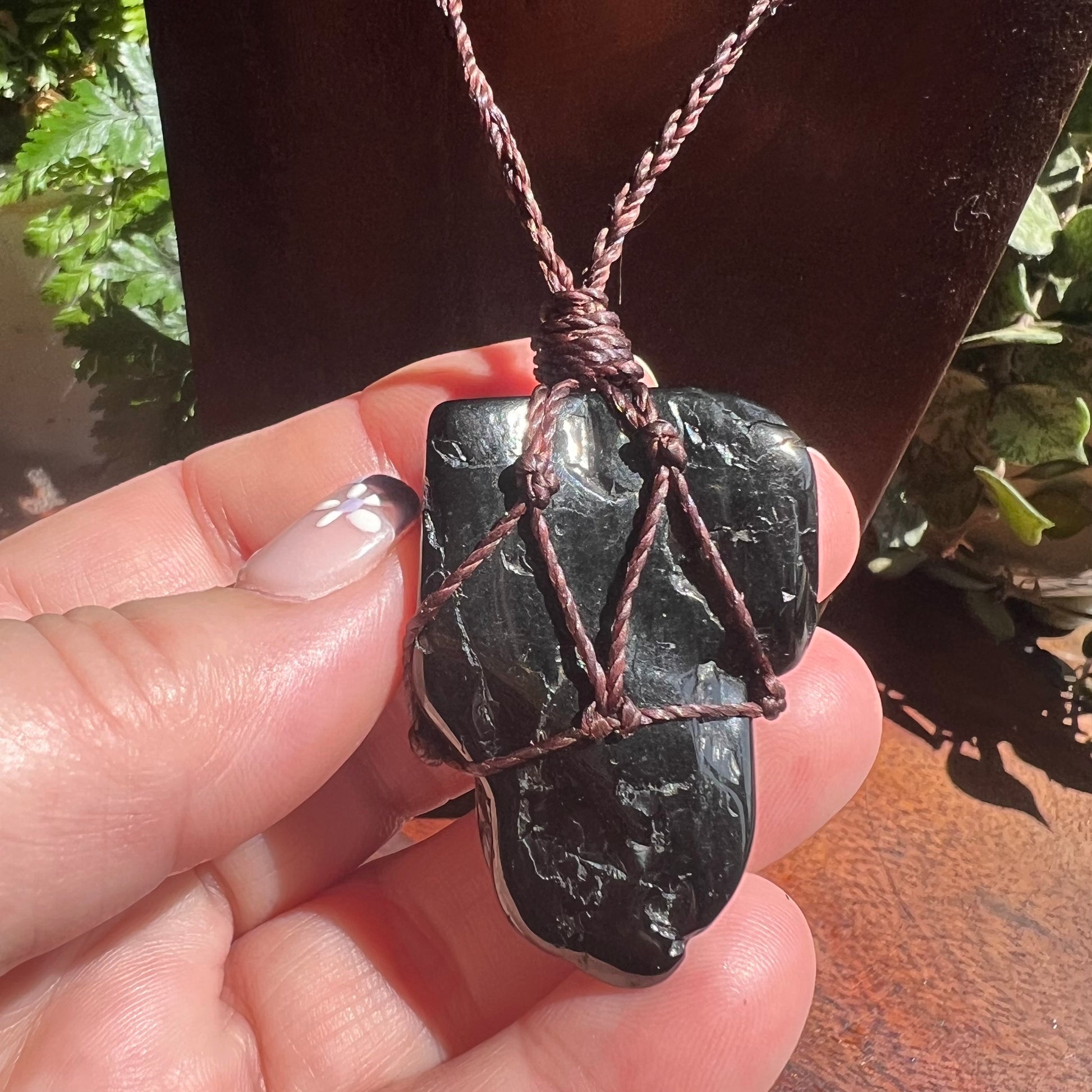 Polished natural Jett Macrame Necklace, a beautiful, comfortable palm sized specimen securely wrapped in chocolate tone cord and tipped with Smoky Quartz.