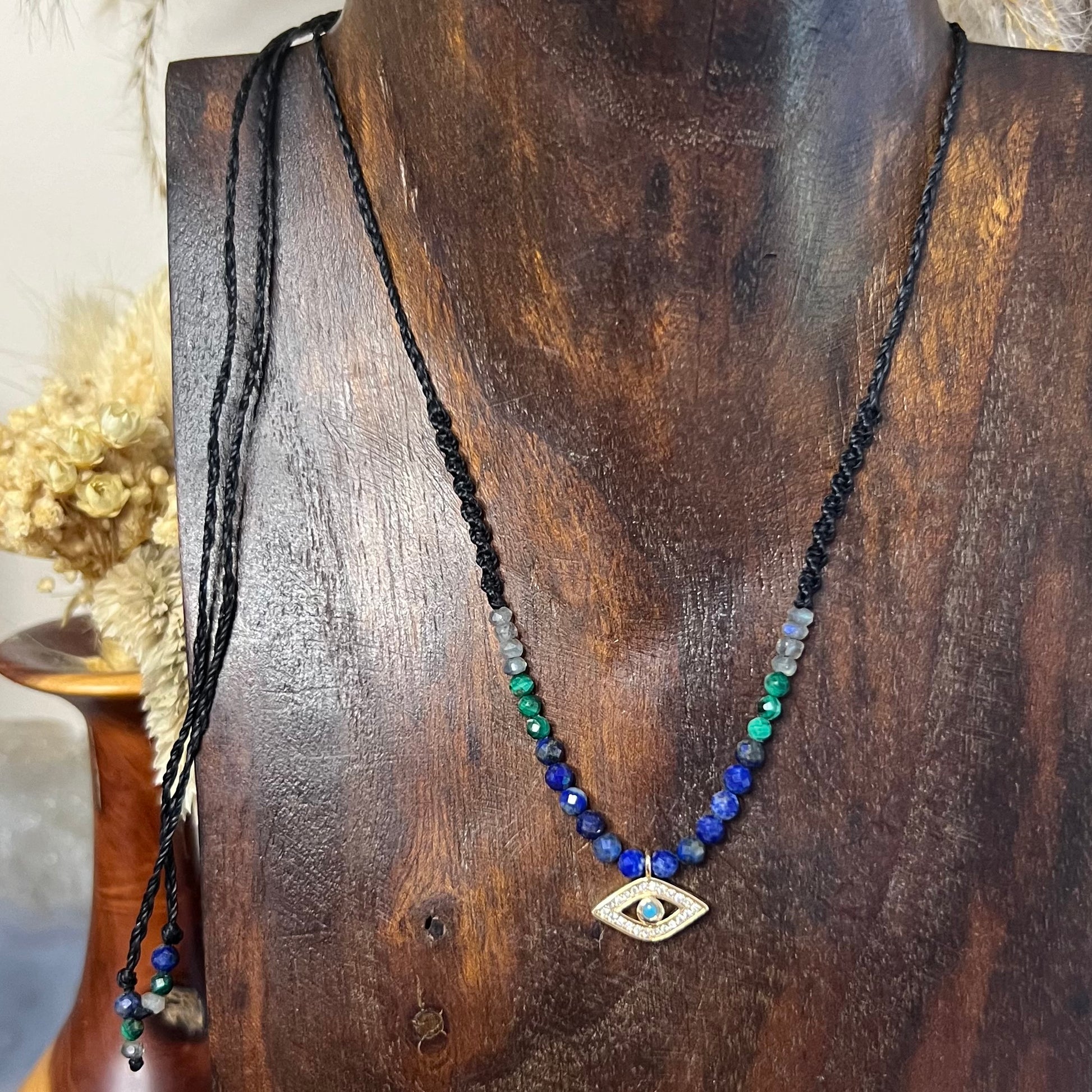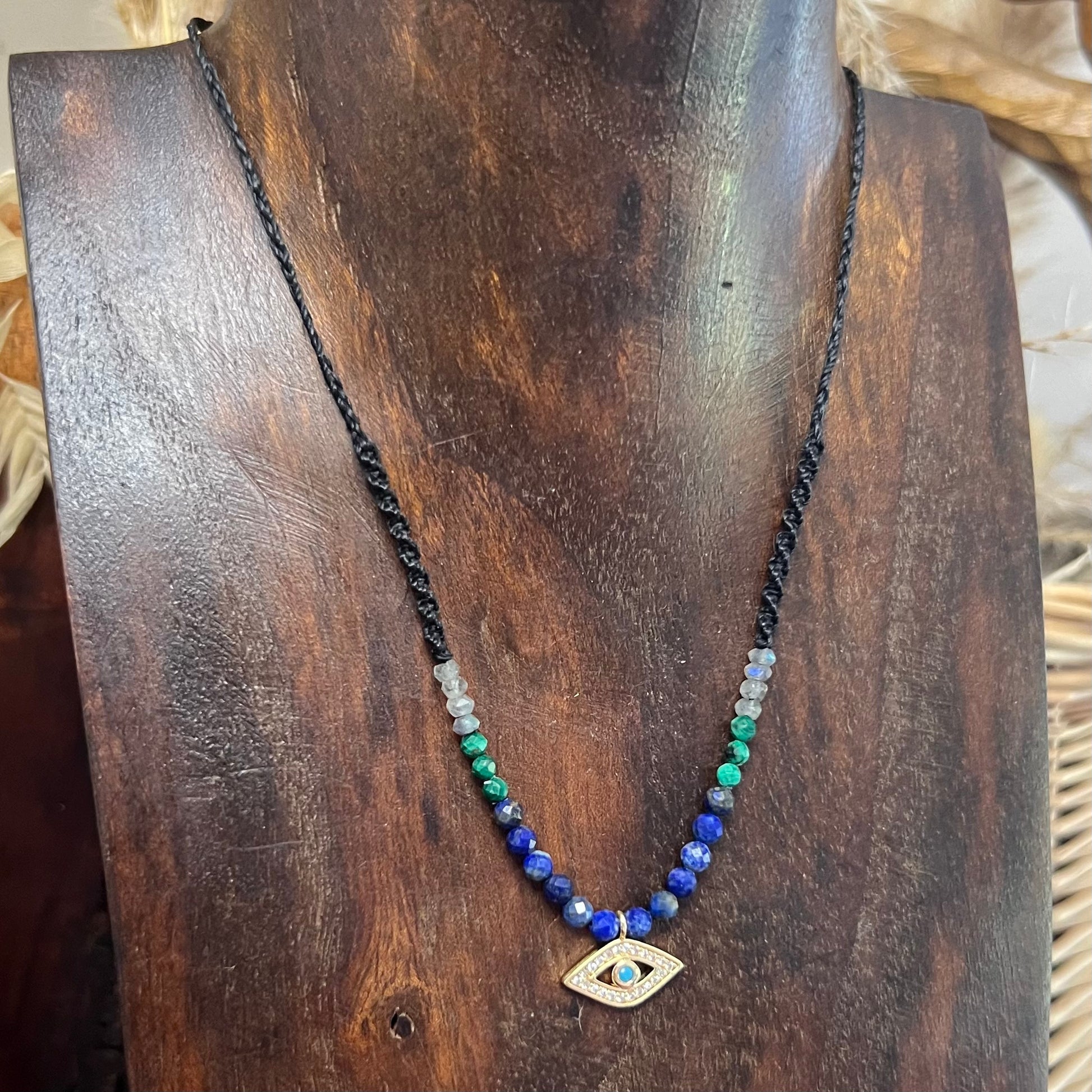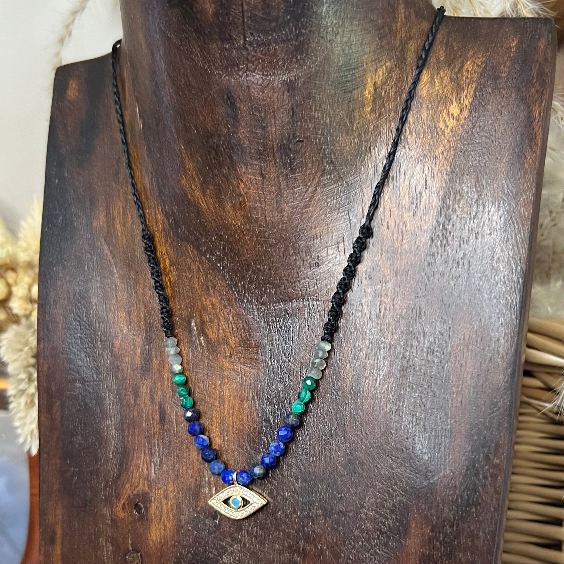 A delicate yet powerful necklace featuring shimmering 2mm faceted gemstone beads—Lapis Lazuli, Malachite, and Labradorite—strung on durable 0.5mm black Linhasita cord. At the center, a sparkling gold-plated Evil Eye charm with cubic zirconia adds a touch of protective magic and elegance.