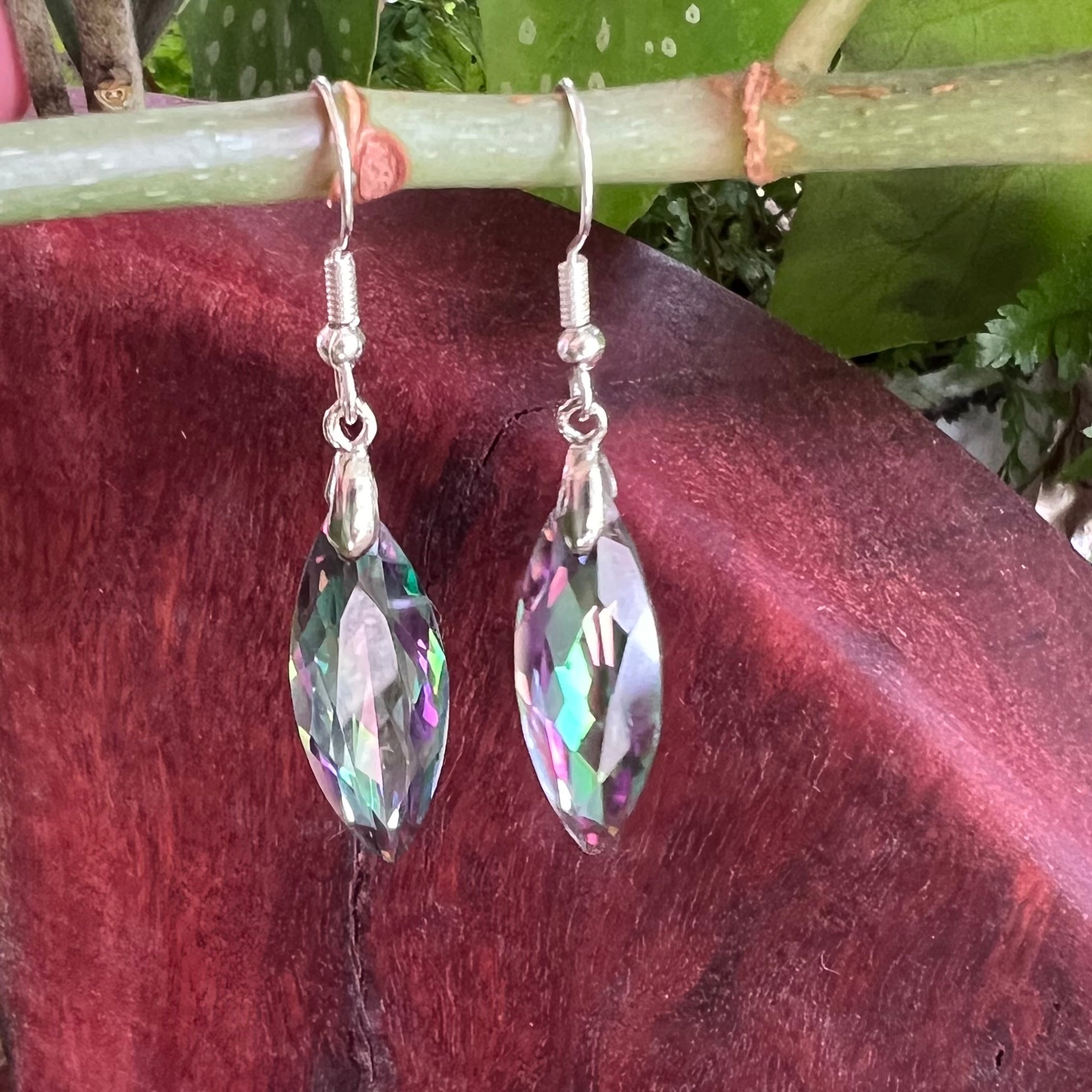 These dazzling earrings feature faceted Aura Quartz drops that shimmer with an iridescent rainbow glow. Their light-catching finish adds a touch of magic and elegances any outfit. Suspended from hypoallergenic surgical steel hooks, they’re as comfortable as they are eye-catching—perfect for adding a little sparkle to everyday wear or special occasions.