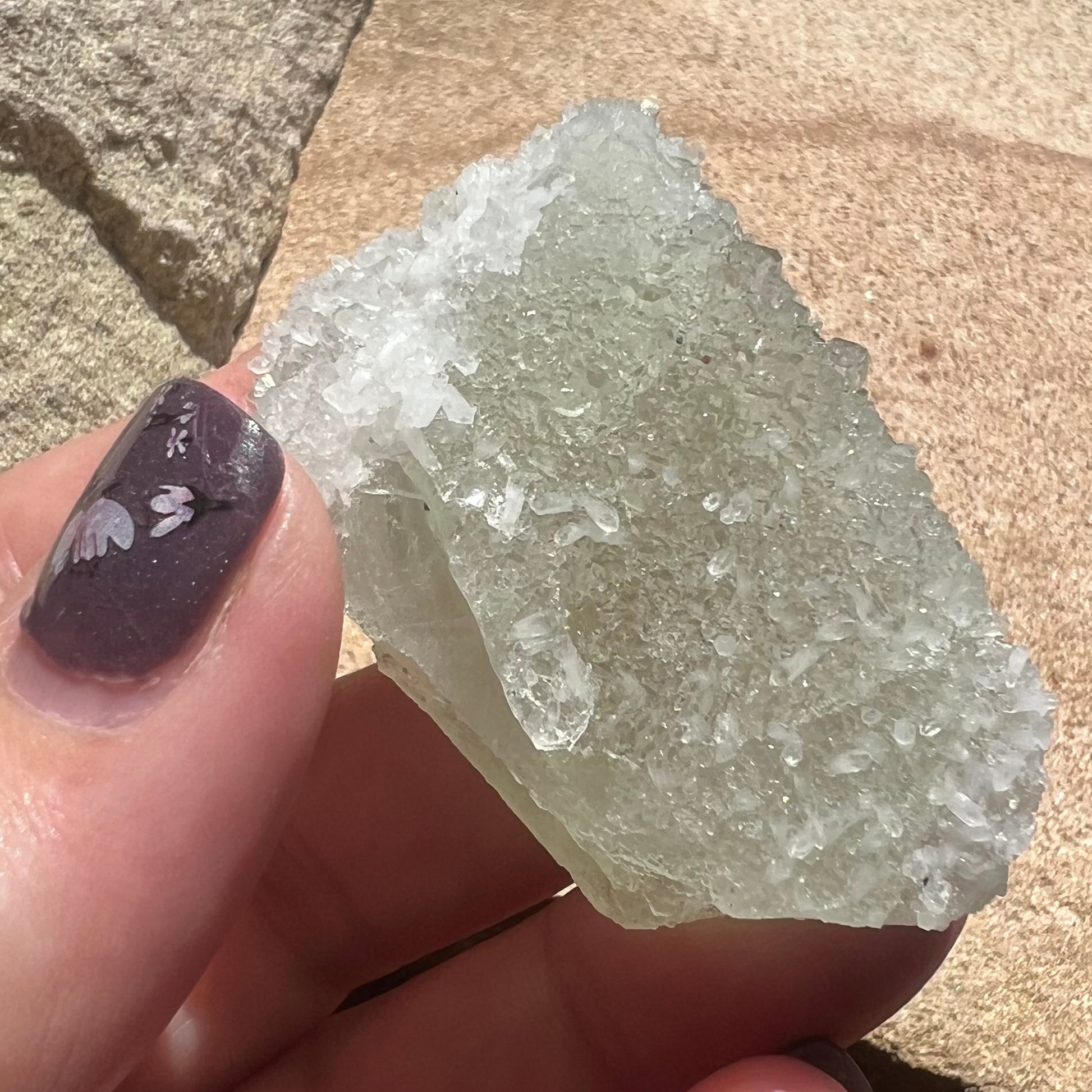A lovely section of pale green octahedral Fluorite with a druzy coating of small Quartz points. A beautiful, sparkly specimen.
