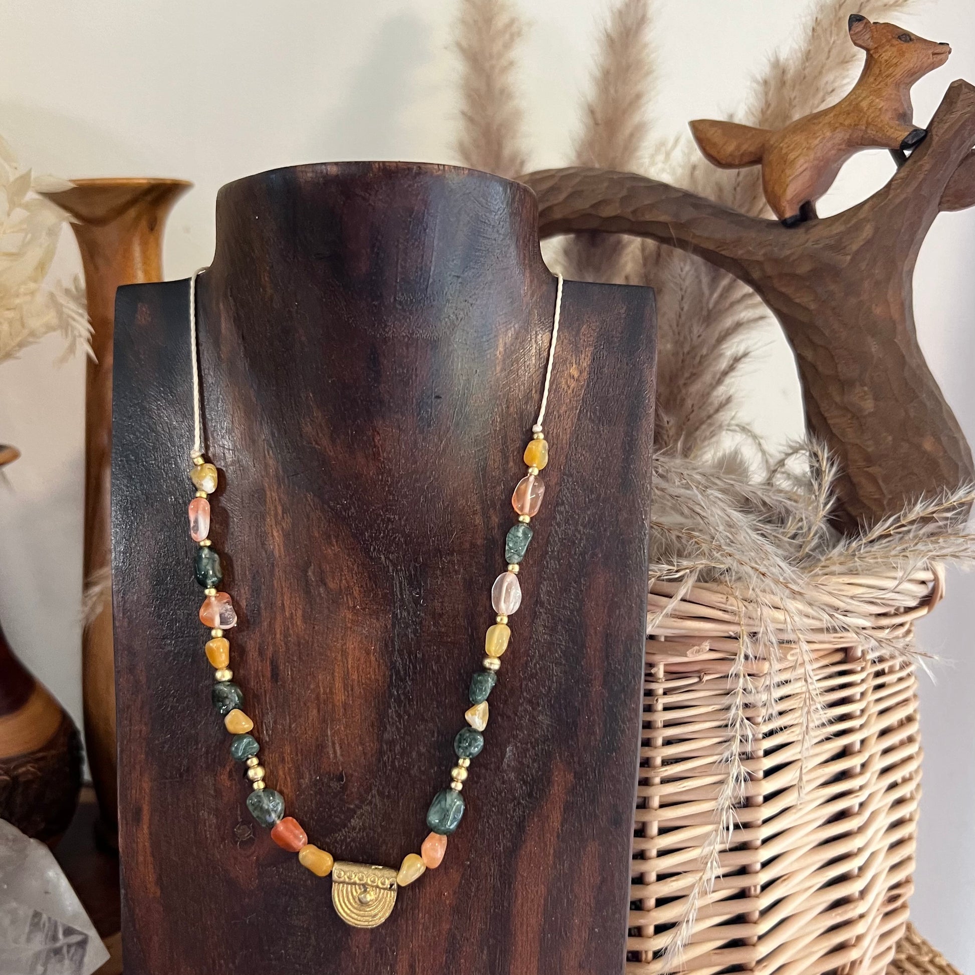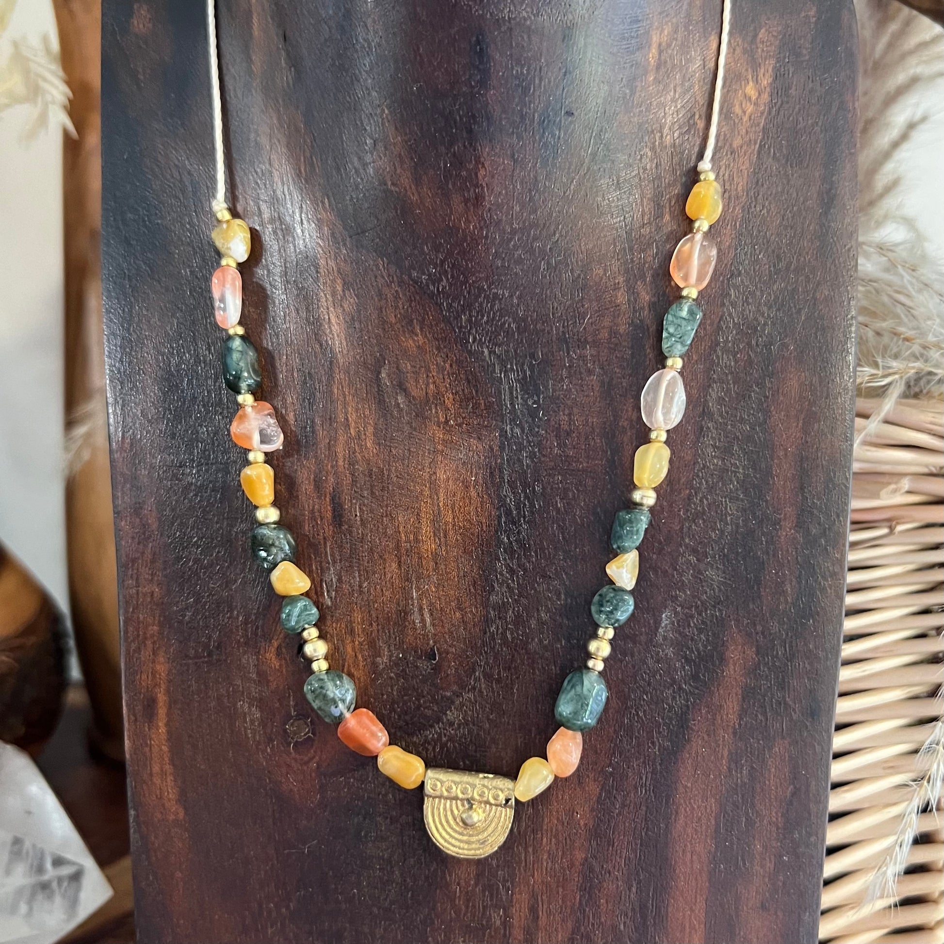 Fortune Quartz refers to the striking inclusions of Chlorite (green), Iron (orange), and Hematite (orange/red), creating its playful style. The necklace is thoughtfully designed to match the different inclusion quartz as closely as possible and accompany them with high-quality brass beads and delicate brass charms. Strung on a durable, adjustable 1mm sand-colour Linhasita cord, the earthy tones are perfect for layering and natural charm.