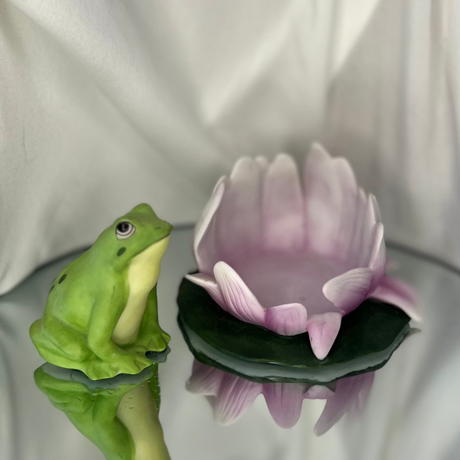 A sweet two-piece fine porcelain figurine set featuring a gorgeous frog sitting inside a lotus blossom home. The little frogs face is sweet and contemplative! A beautiful display for a nursery or a highlight for any frog collector and woodland creature lover.
