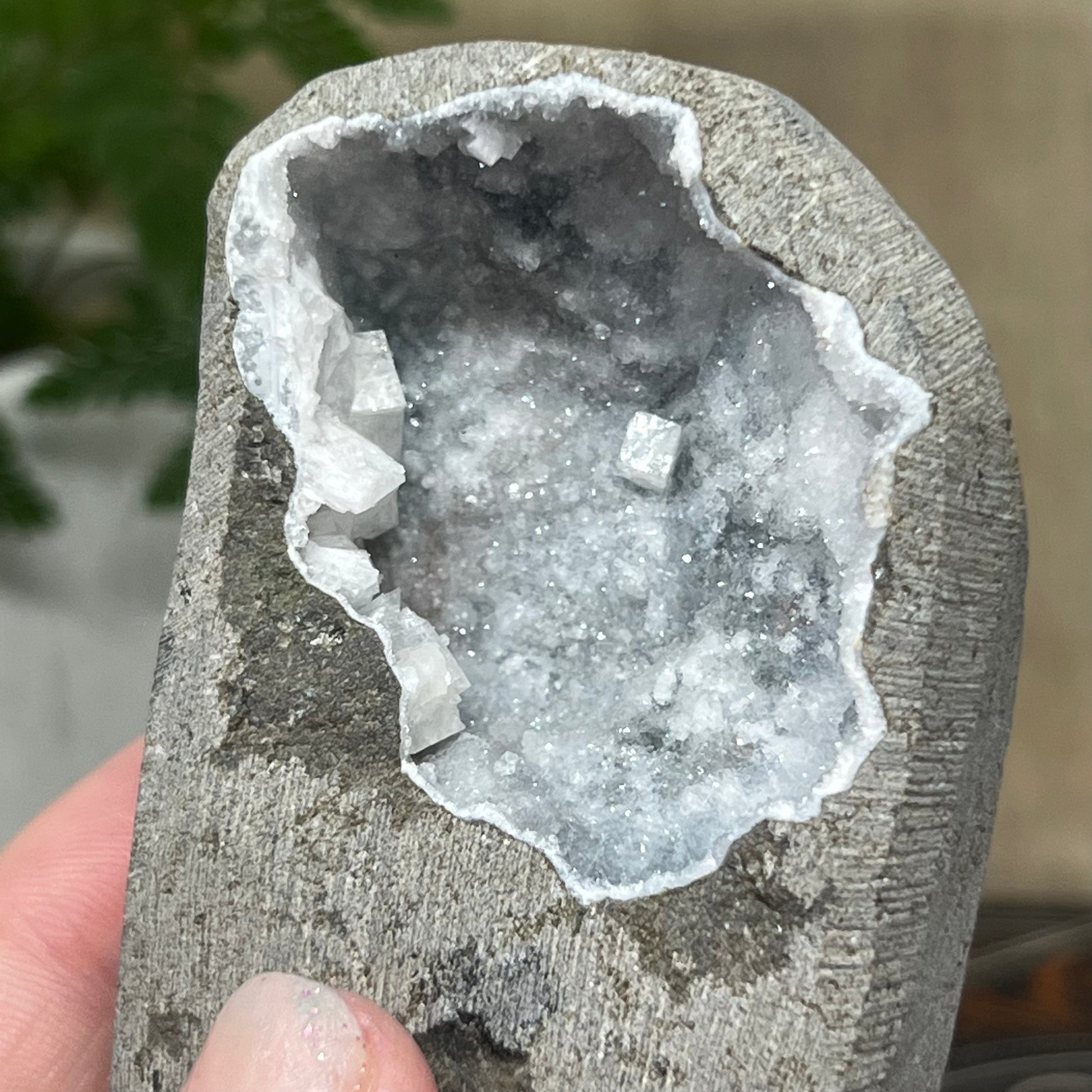 This polished geode specimen features a display of white/clear crystal Quartz Chalcedony druzy with Apophyllite cubes and Calcite deposits in a beautiful, roughly polished geode display.