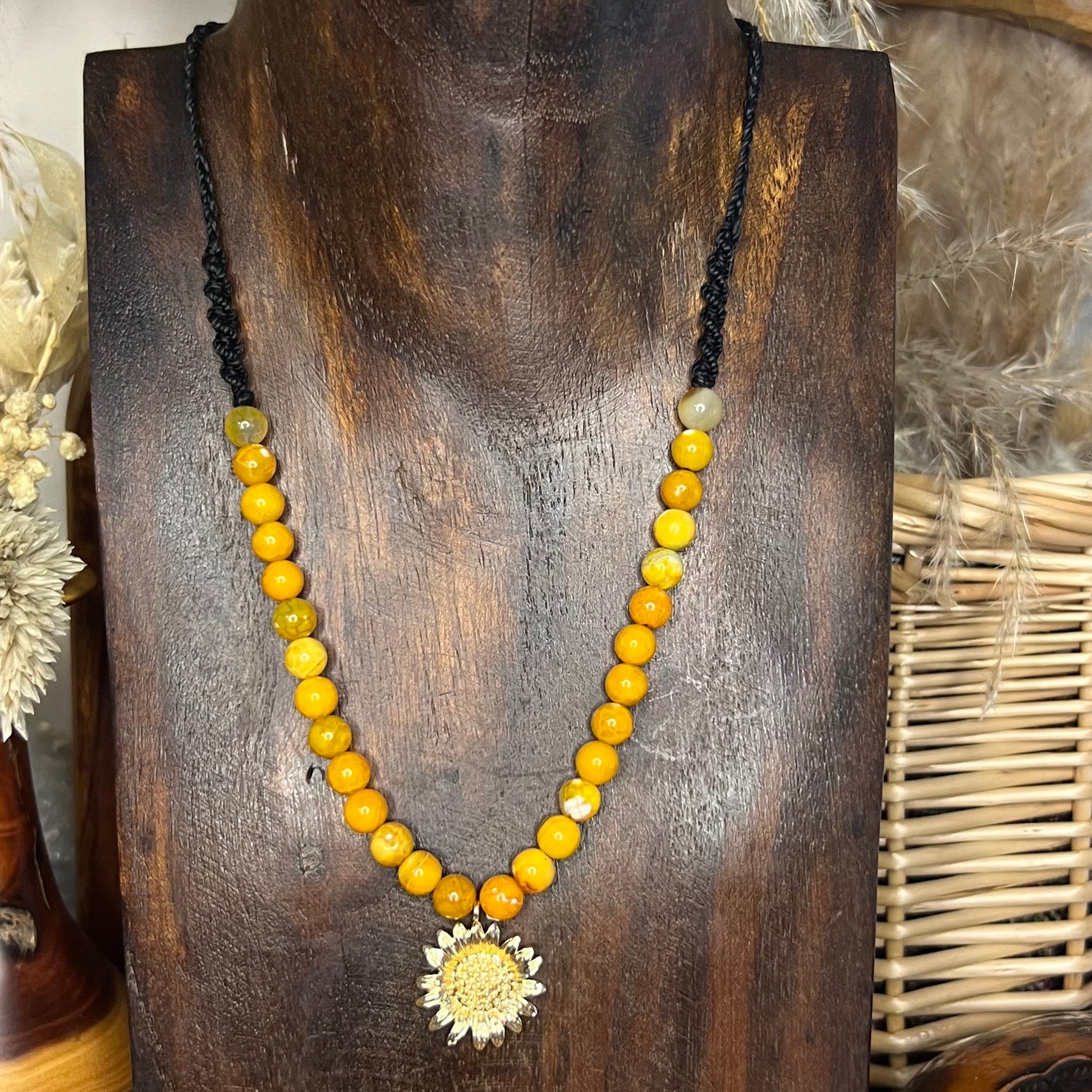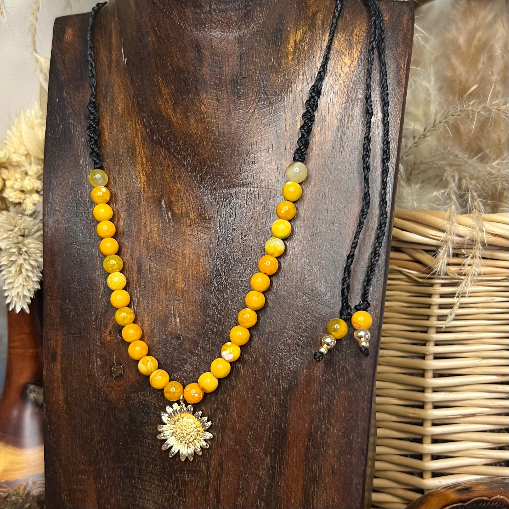 Sunshine Yellow Agate & Golden Sunflower Macrame Necklace