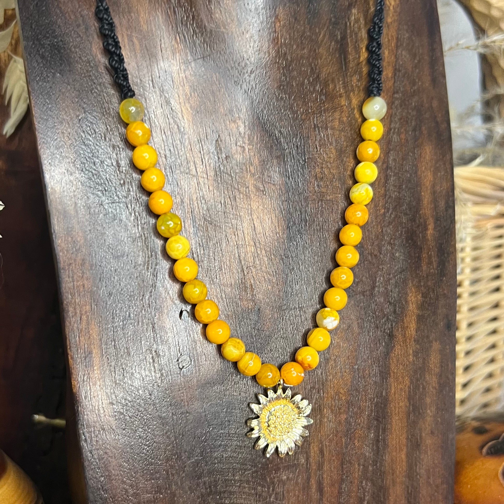 Bright, joyful, and full of warmth, this vibrant necklace features sunny 6mm dyed Agate beads paired with the sweetest gold-plated Sunflower pendant. Woven on comfortable and durable 1mm black Linhasita cord, this necklace is a perfect sunny statement to lift your mood and brighten your day. 🌻