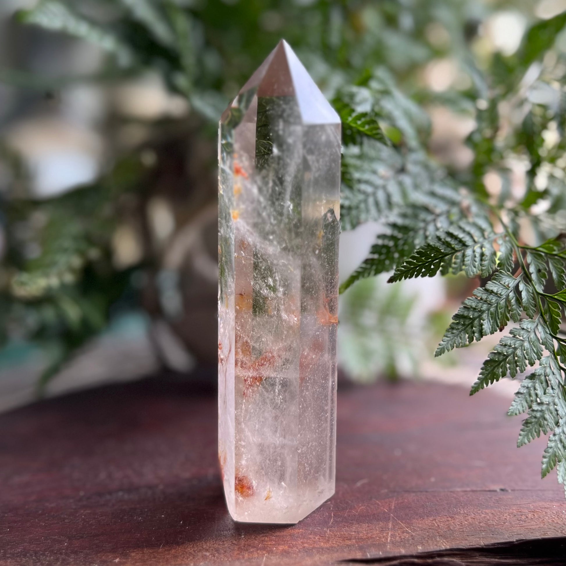 A beautifully polished point with iron staining inclusions, naturally twisting through it's growth patterns like life's blood. This point also has a phantom shimmer of unknown silvery-white inclusions toward the side at the top. Â