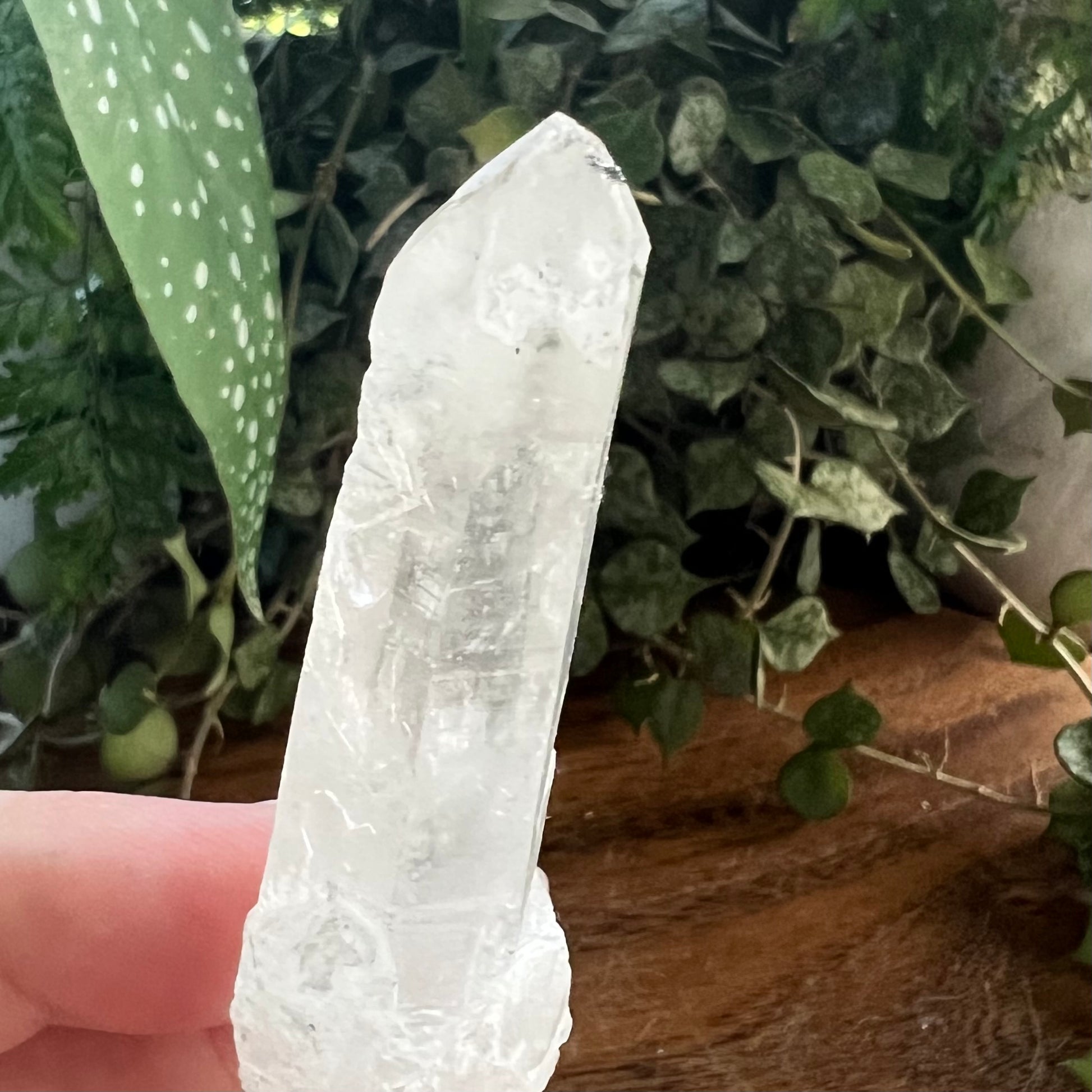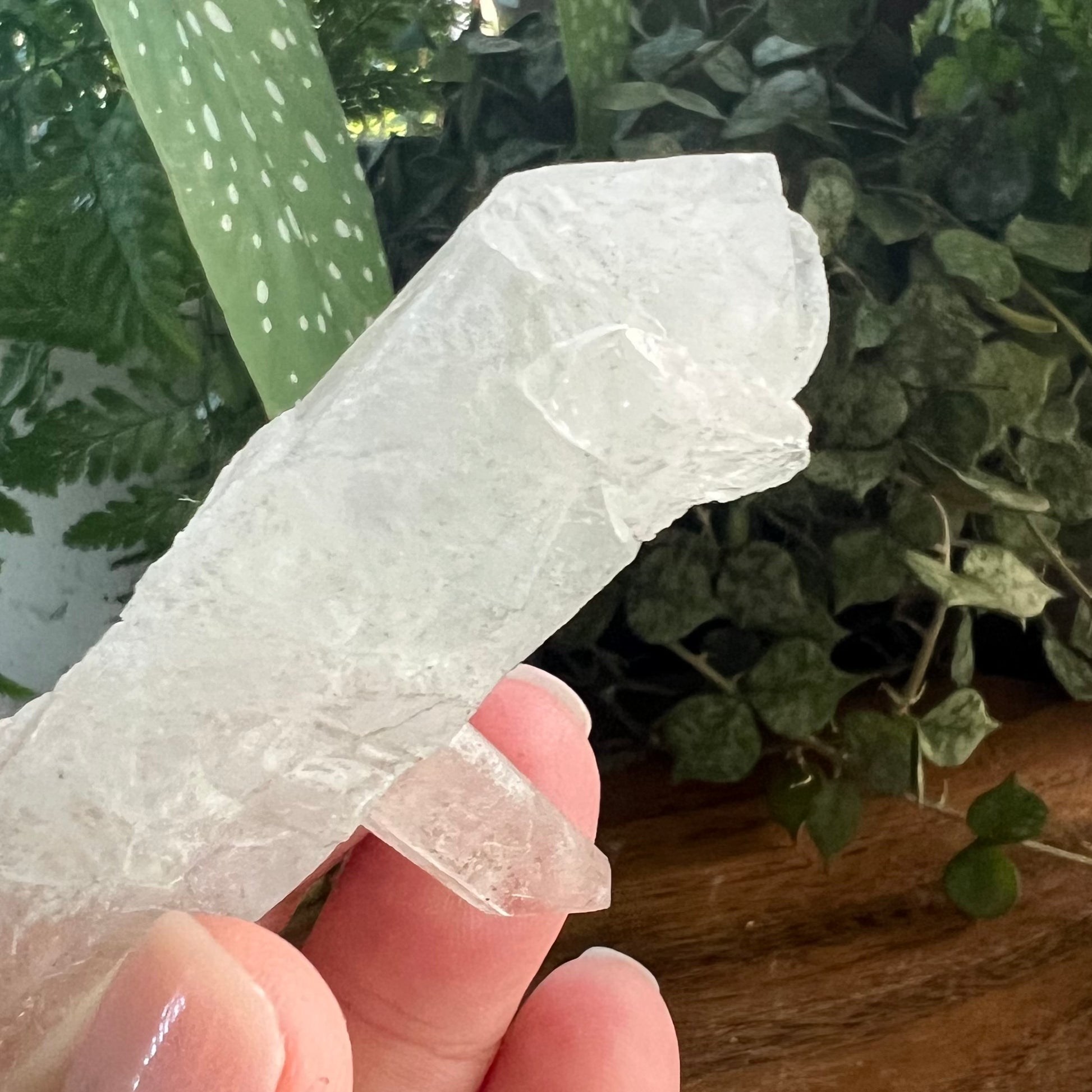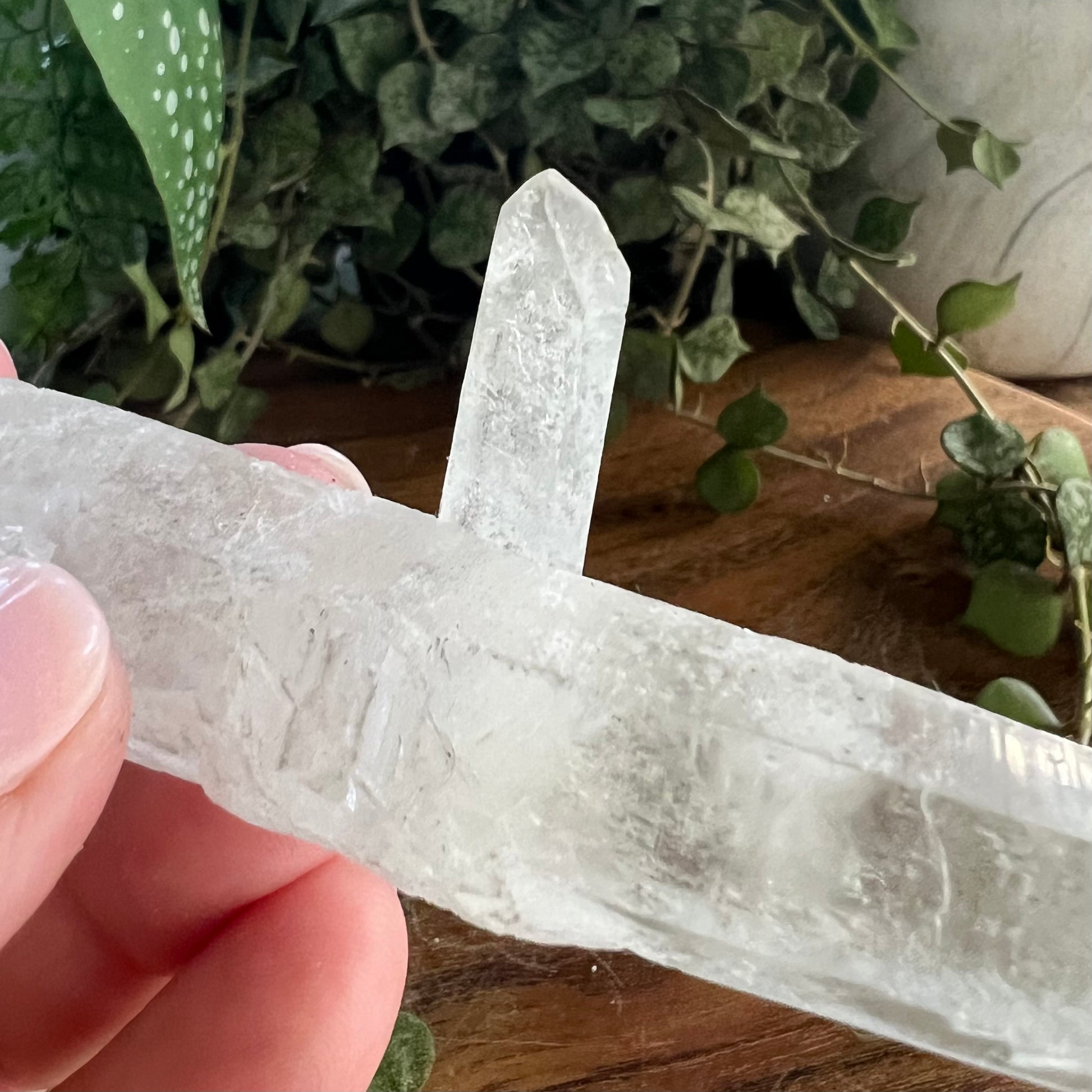 This is a beautiful double terminated quartz wand, with self healed and capped base. This specimen features a single terminated cross point and specularite in the tip. This beauty has etched and frosty quartz external later and clear core. The section where the small point crosses has signs of self-healing. Quartz from this region often possess cracking injury and self-healing due to the extensive and continual seismic activity of the region.