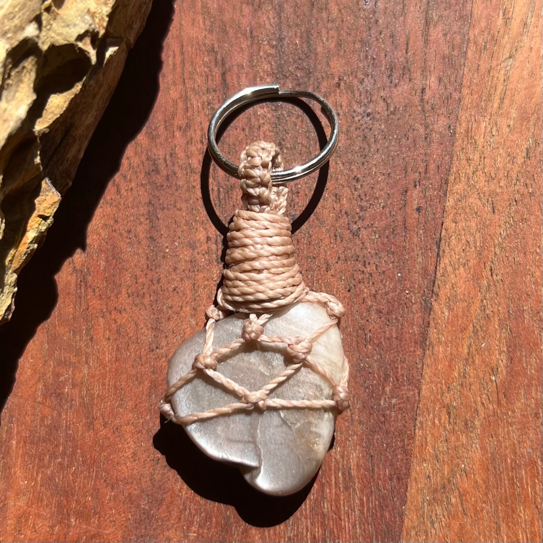 This hand selected flashy Peach Moonstone crystal has been securely woven into 1mm Brazilian Linhasita cord and added onto a Stainless Steel keyring for easy use.