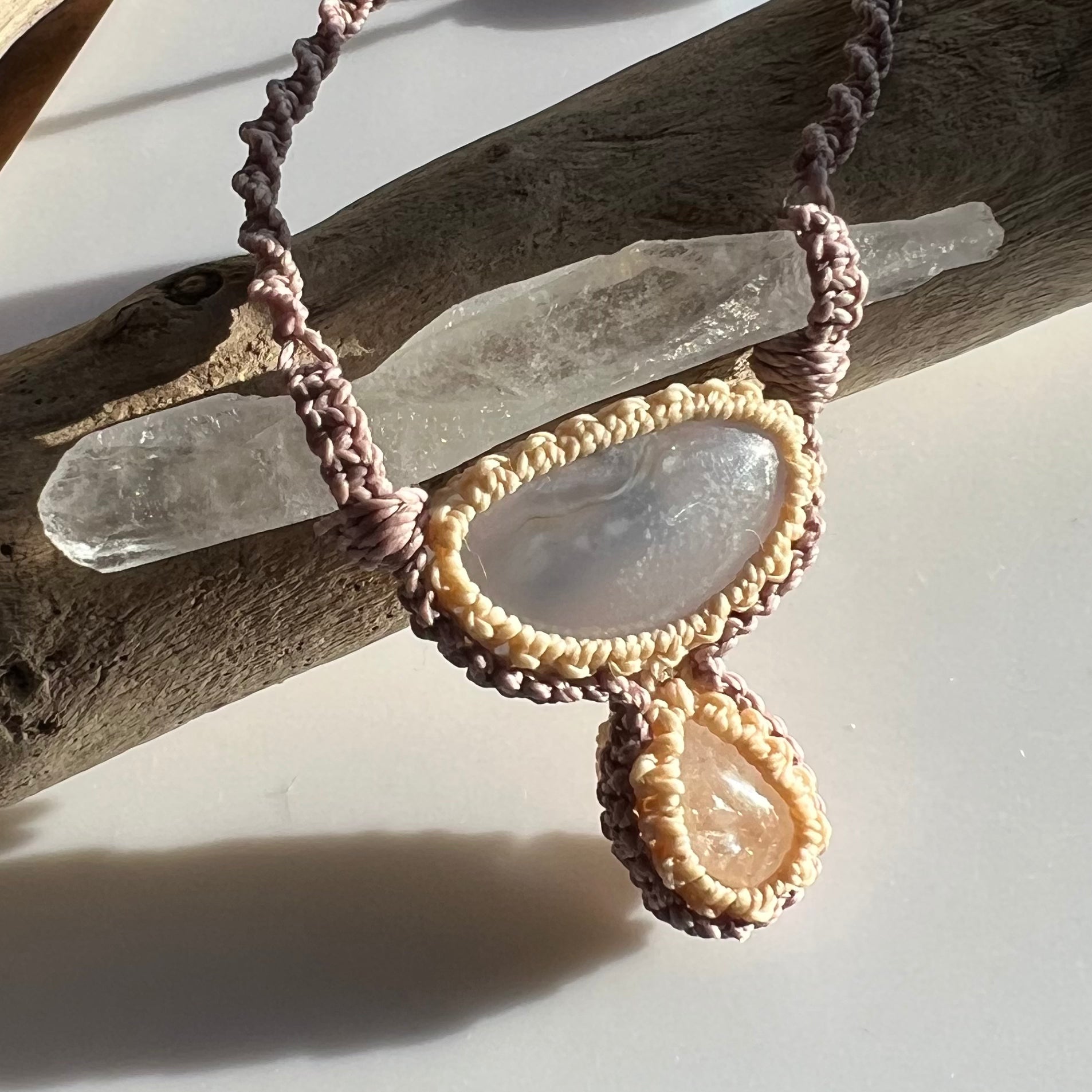 'Elinahi' has been woven with sweet Mushroom tone cord, with an inset of cream, bringing a gentle and feminine aesthetic. Blue Chalcedony for Harmony and Balance, along with golden toned Quartz for Clarity and Amplification have been framed and woven into the pendant panel for additional energetic support.