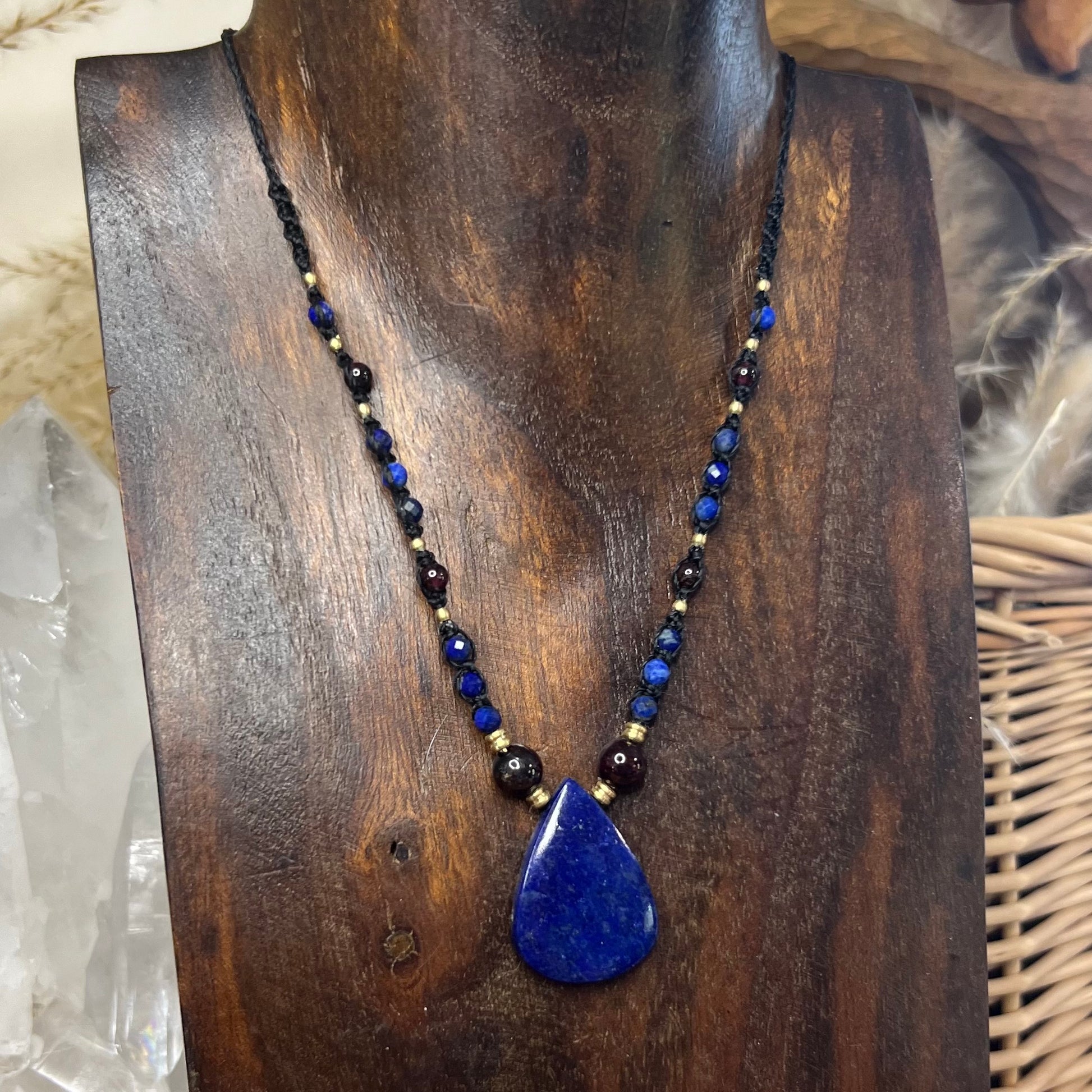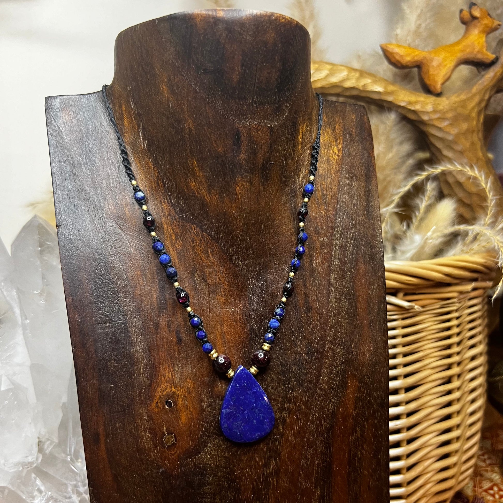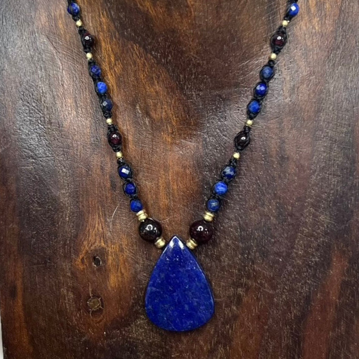 Lapis Lazuli, Garnet & Brass Crystal Macrame Necklace