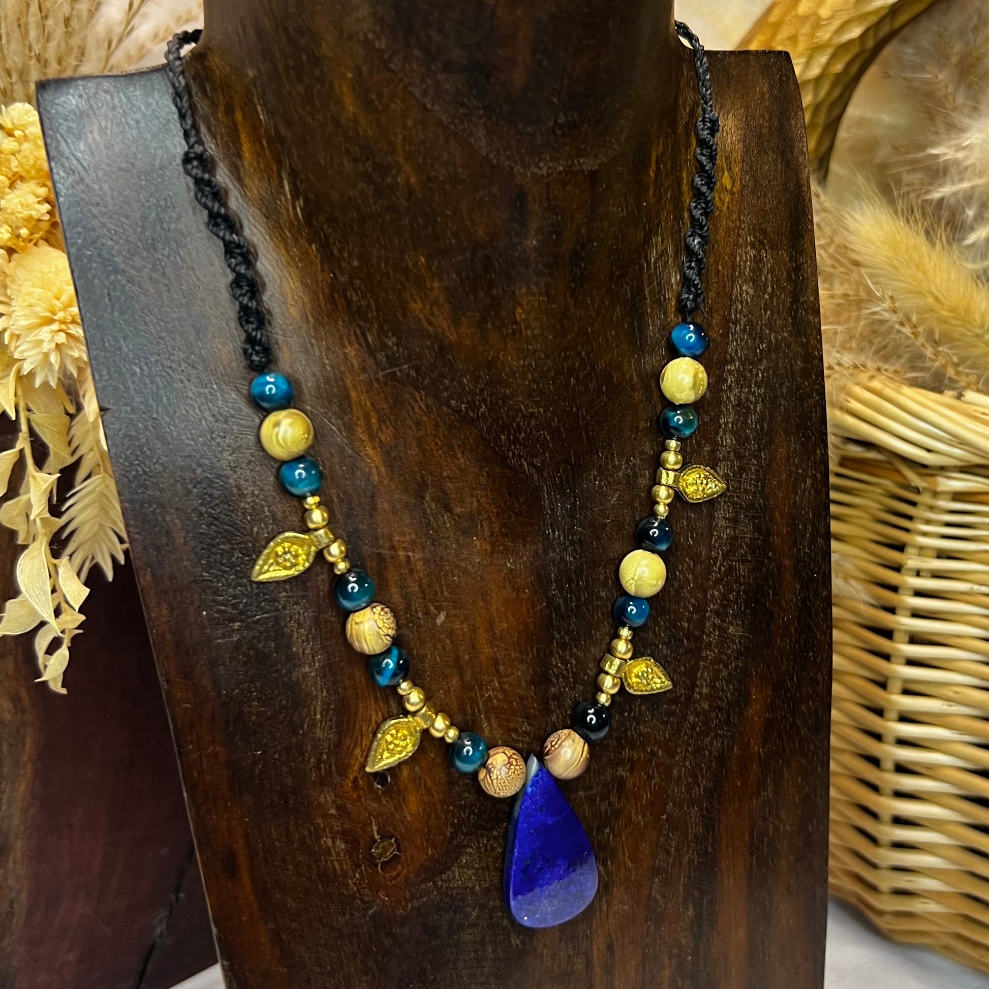 Lapis Lazuli, Tiger Eye, Brass & Wood Crystal Macrame Necklace