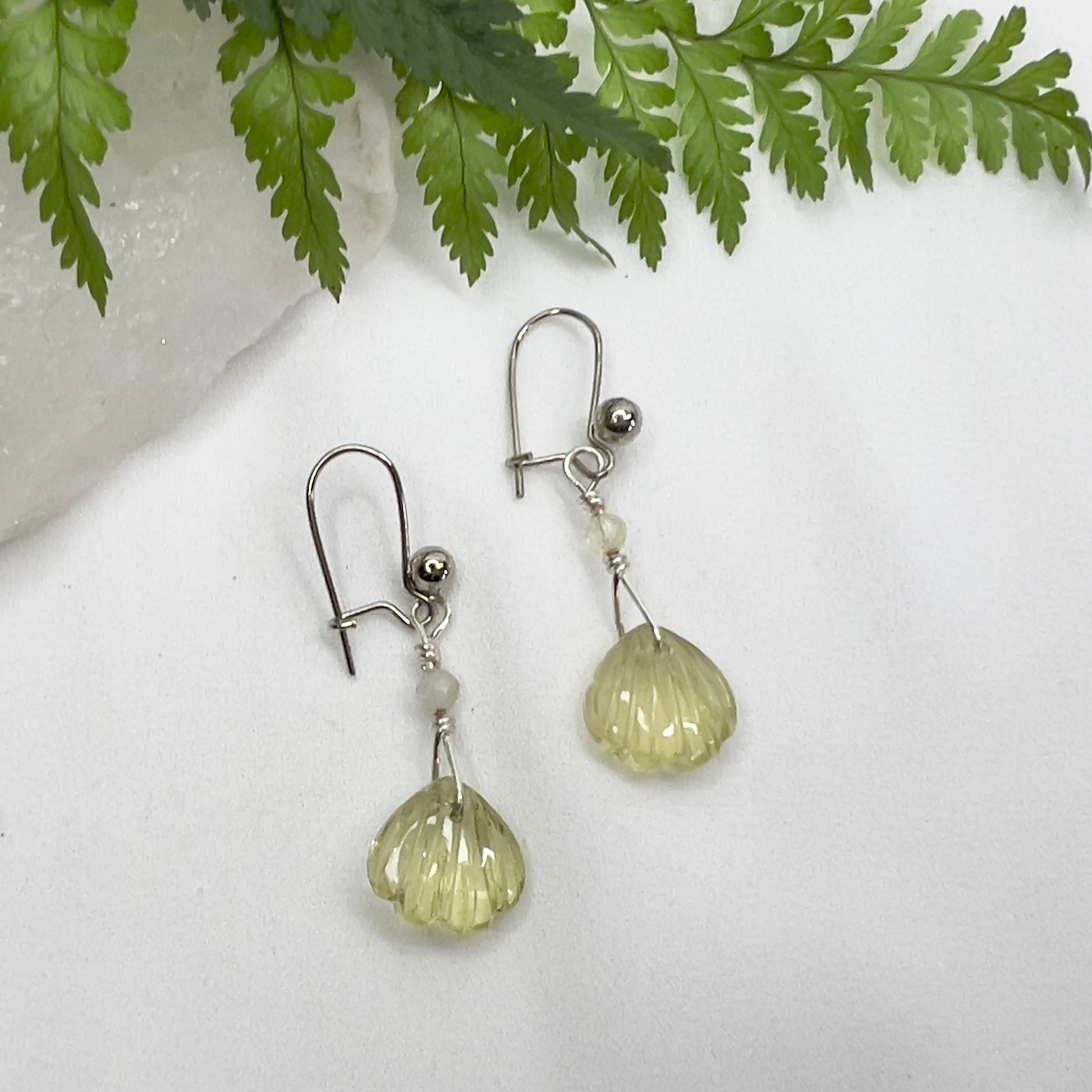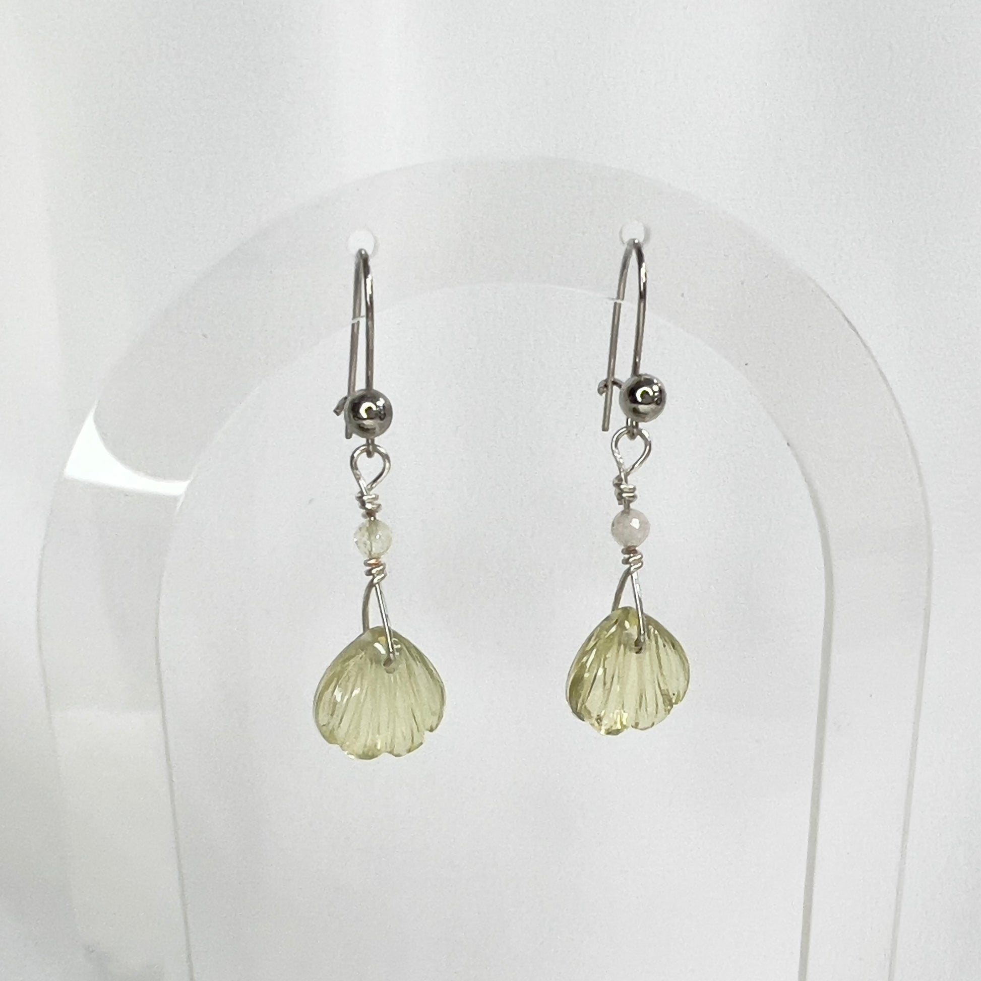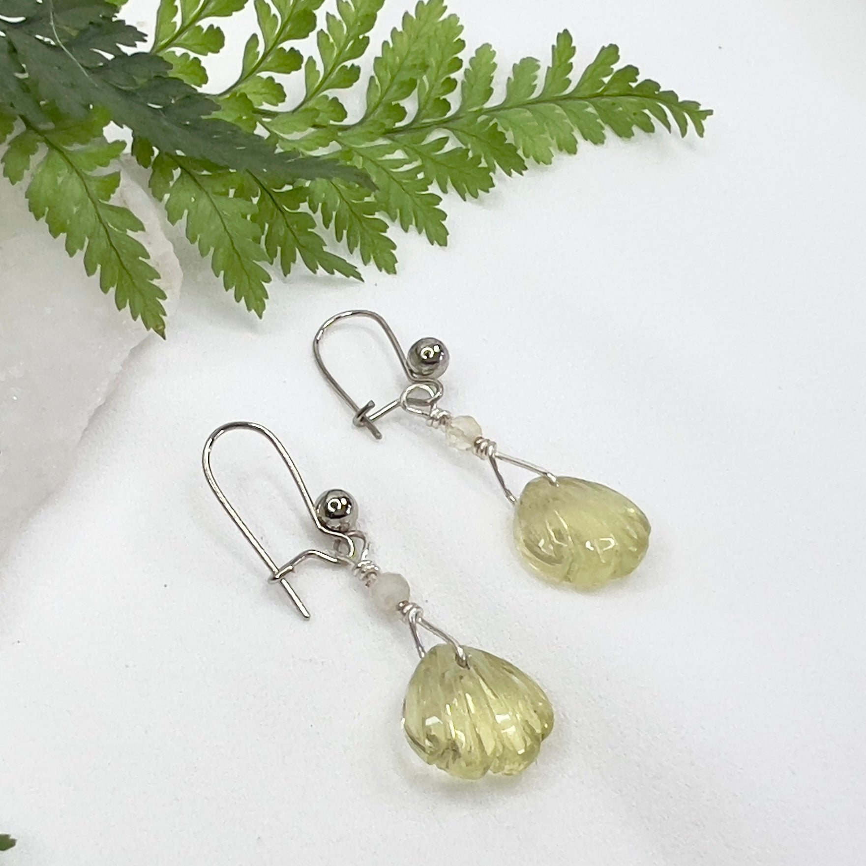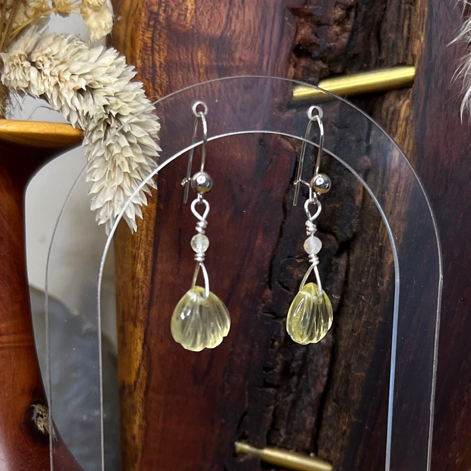 These stunning earrings feature beautifully carved Lemon Quartz carved Shell drops, accented with petite faceted Golden Rutilated Quartz beads. Crafted with high-grade surgical steel kidney style hooks, they offer both radiant beauty and lasting comfort—perfect for adding a touch of golden glow to your day.