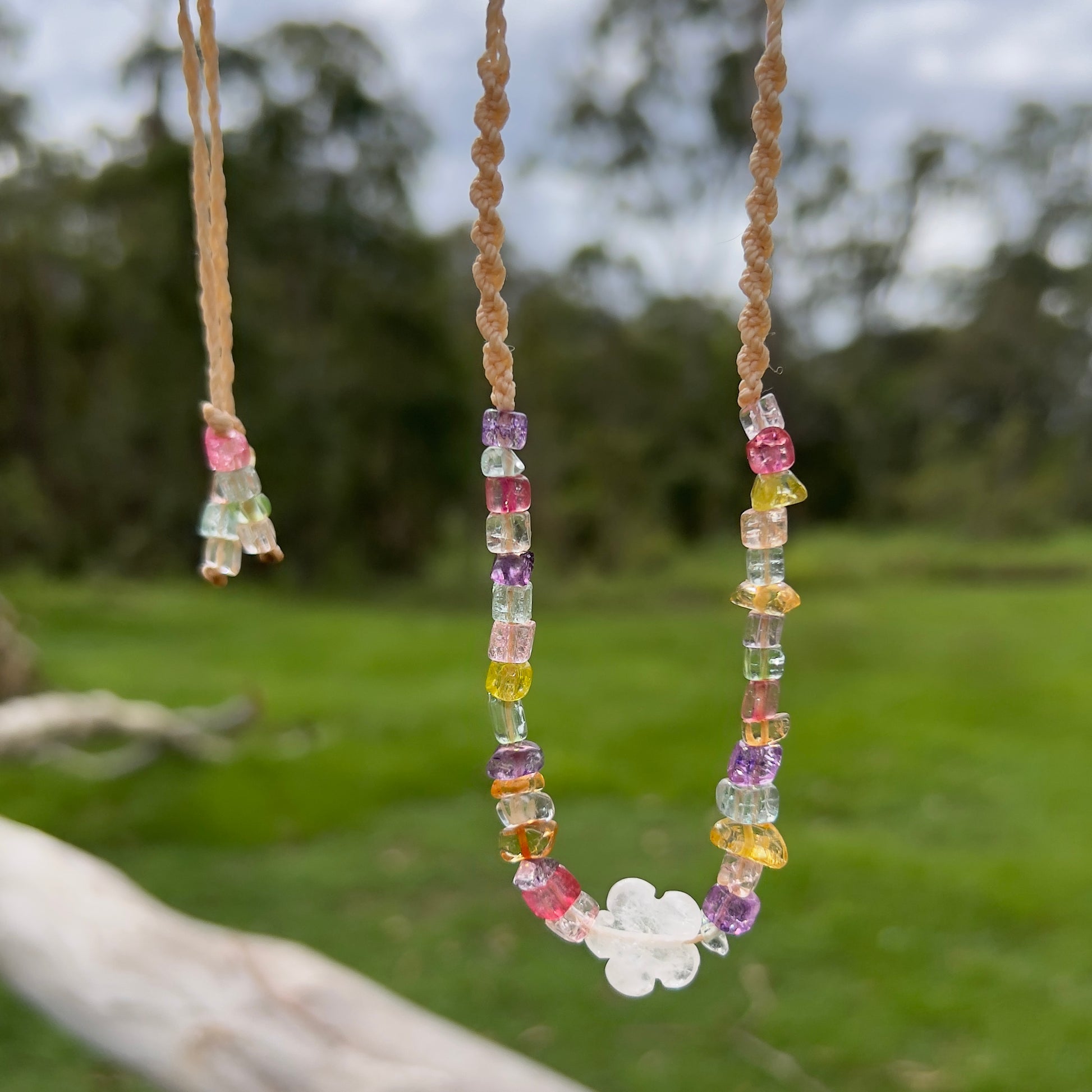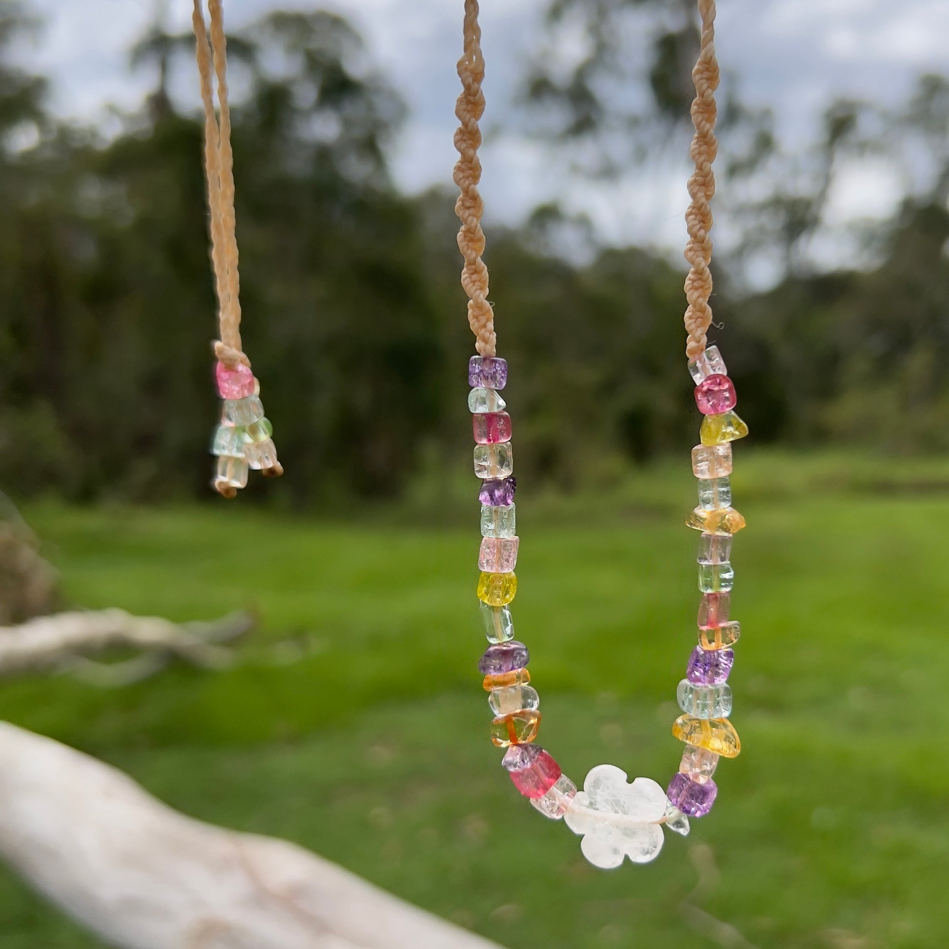 Brighten your energy and your outfit with this handcrafted macramé necklace, combining the delicate clarity of Clear Quartz Daisy Beads with the bold, expressive hues of Dyed Quartz. This unique blend of natural and enhanced stones creates a beautiful harmony of color, intention, and style.