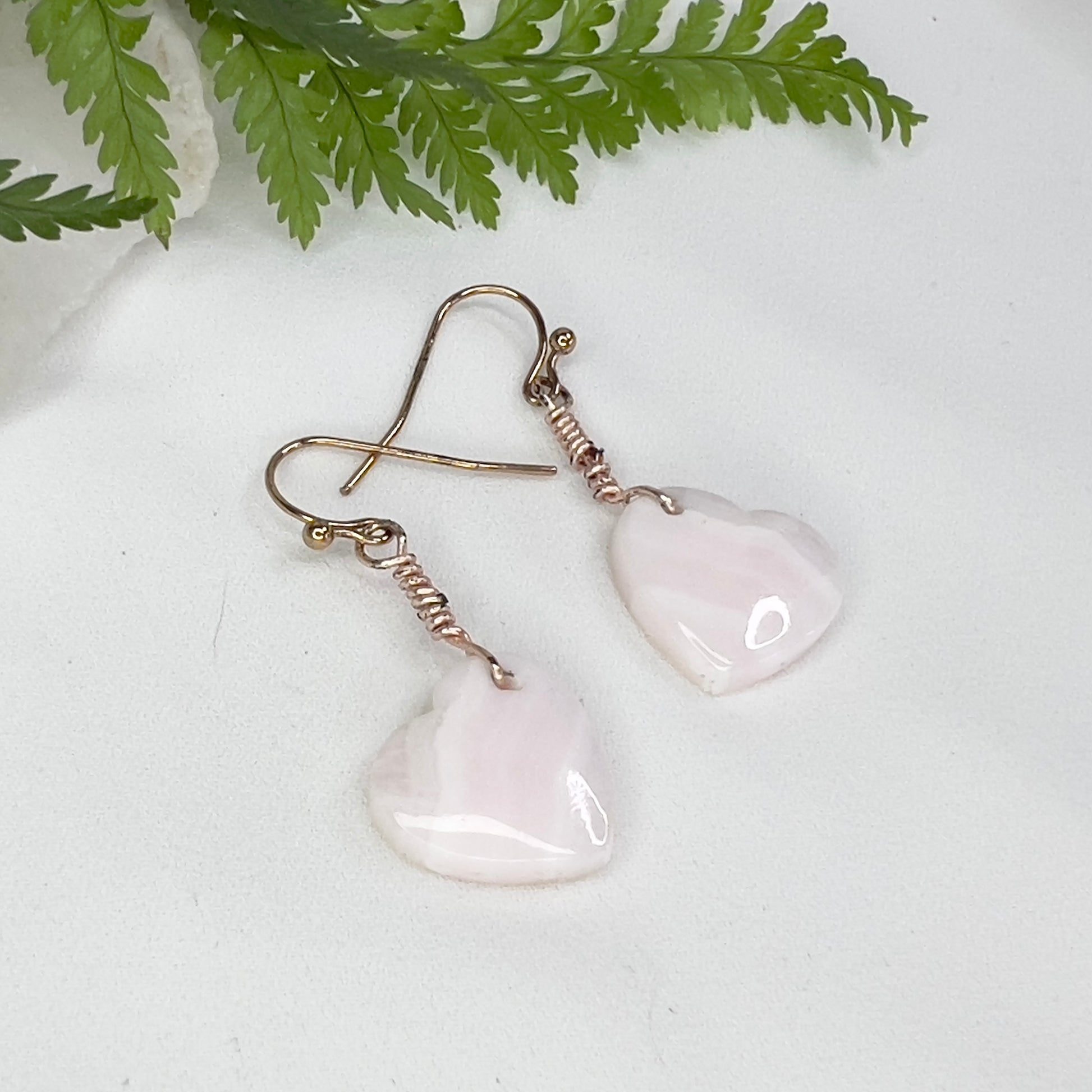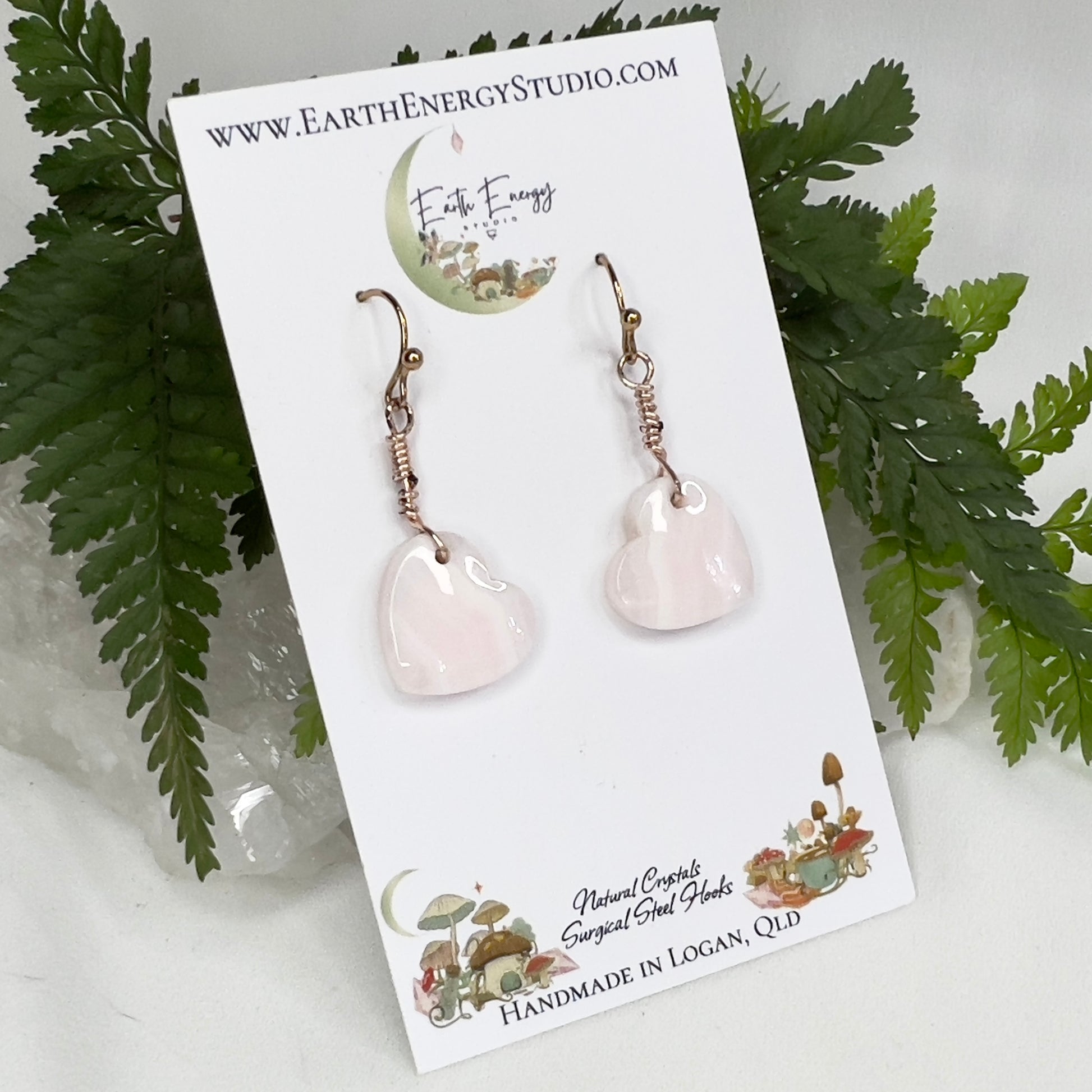 Delicate and uplifting, these earrings feature soft pink Mangano Calcite hearts paired with elegant rose gold-tone surgical steel hooks. Lightweight and hypoallergenic, they offer a charming blend of gentle beauty and everyday comfort.