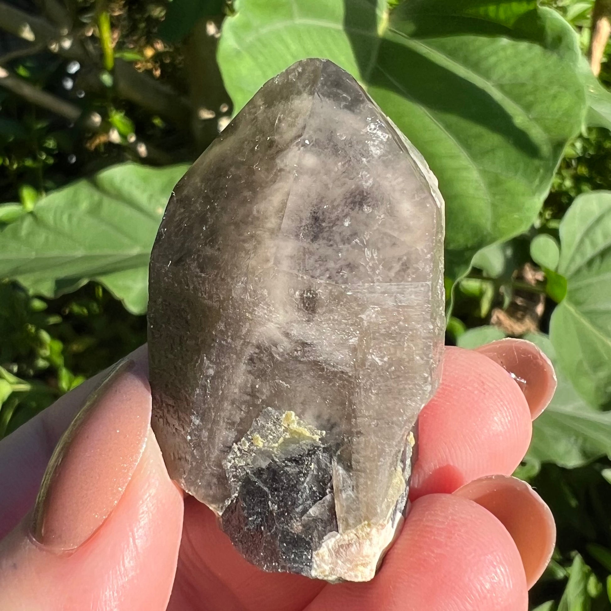 A natural specimen with the pale Smoky cap damaged around the base and imprints during mining process.