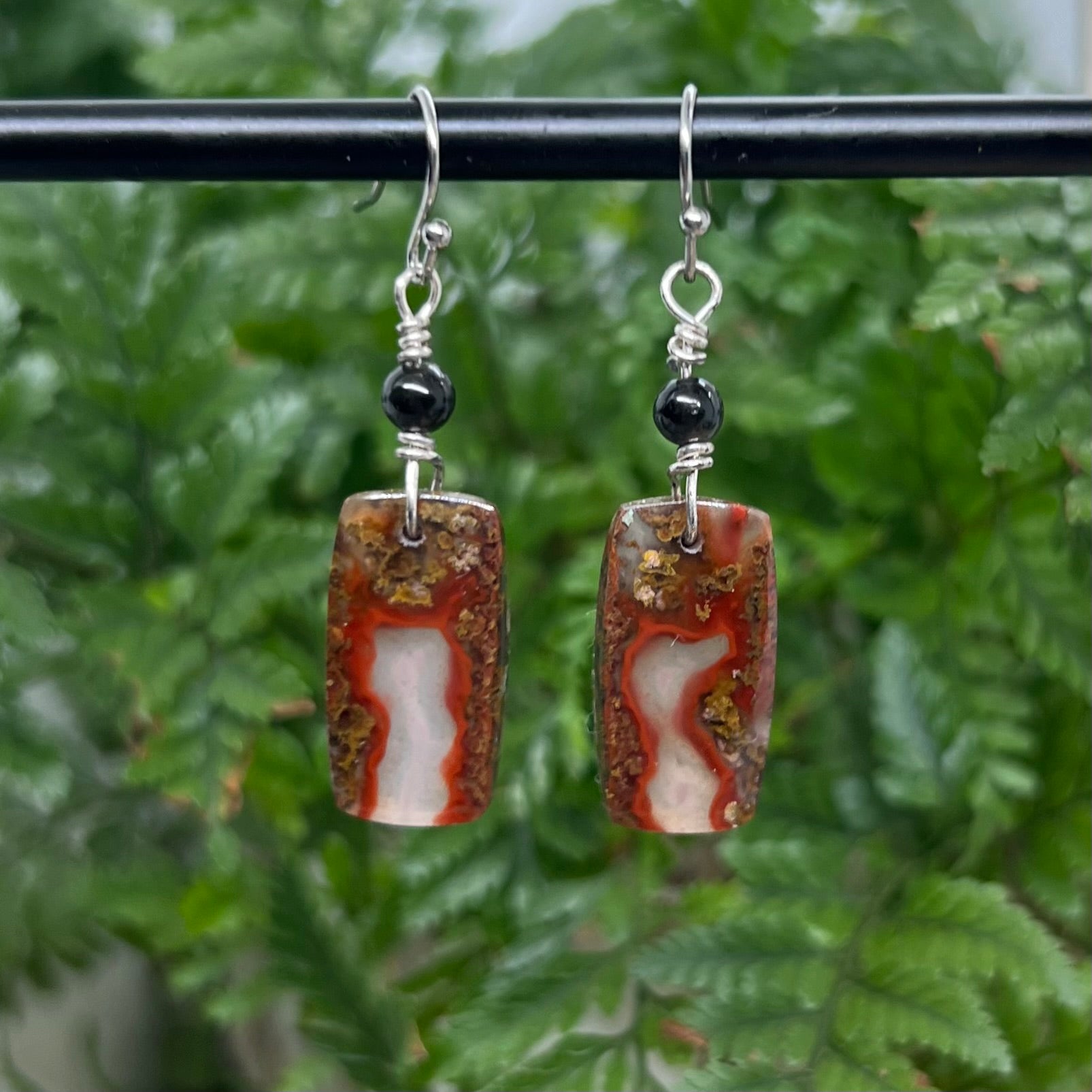 These stunning Moroccan Seam Agate with Obsidian crystal earrings, crafted with durable surgical steel ear hooks, are beautiful works of Mother Nature’s art—perfect for adding earthy elegance and natural charm to any outfit.