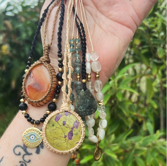 Moss Agate and natural wood Crystal Macrame Necklace