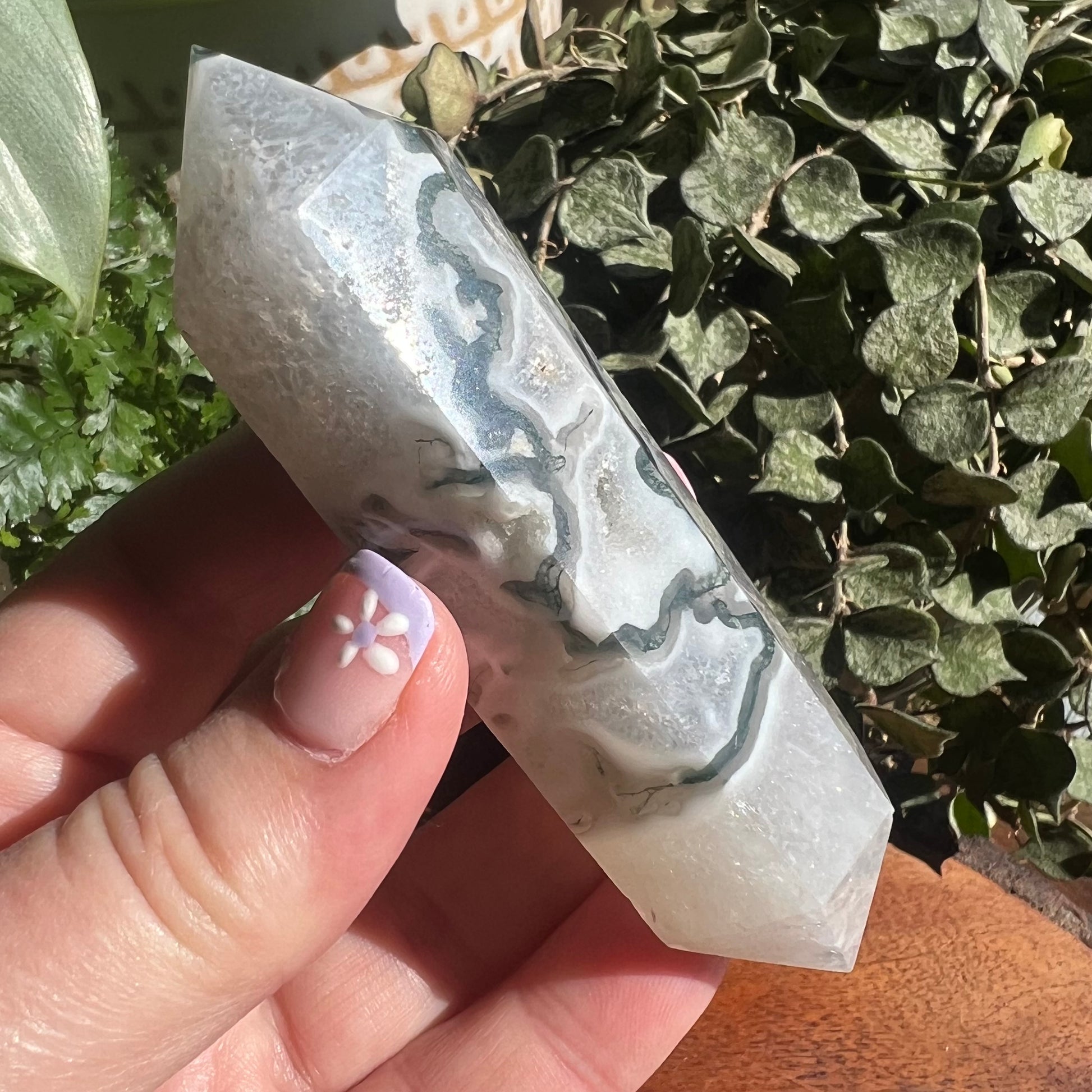 This polished Moss Agate is a gorgeous clear agate with swirls of white and green and druzy pockets. This is the largest of the selection I currently have available.