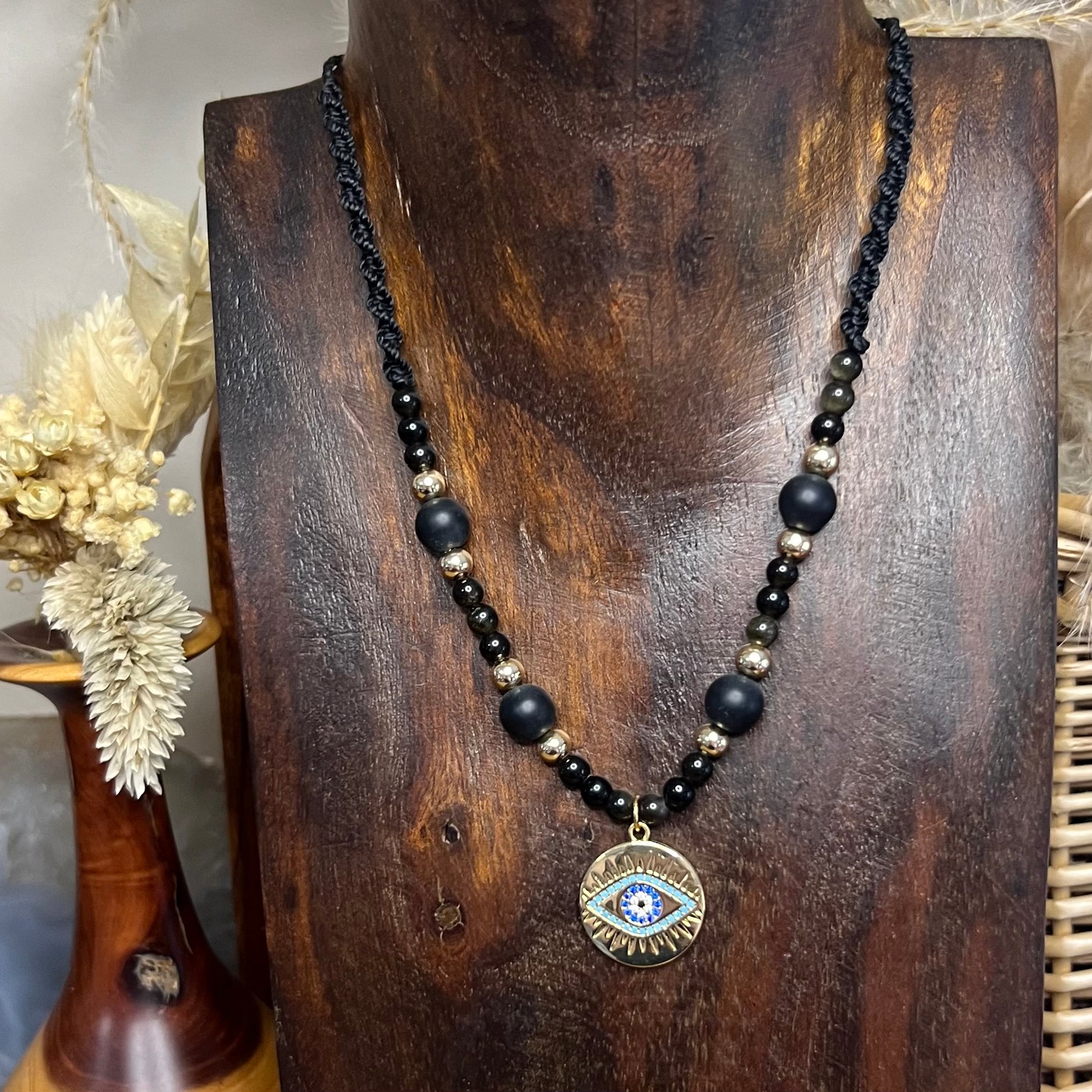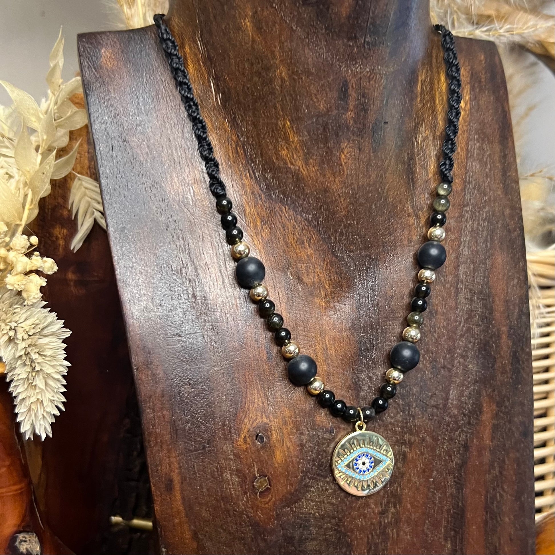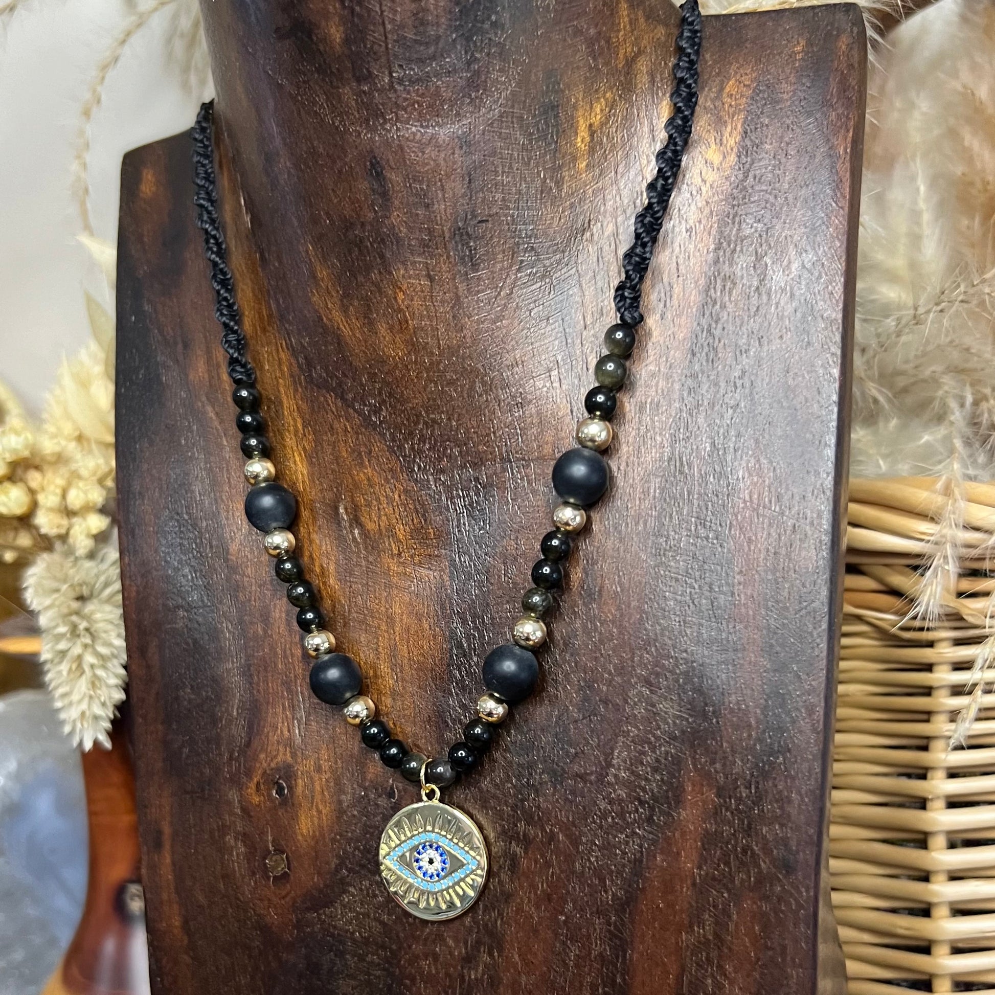 Harnessing protective, grounding energies, this necklace features Gold Sheen Obsidian and Onyx beads paired alongside an Evil Eye pendant adorned with sparkling cubic zirconia. Woven with 1mm black Linhasita cord, this necklace blends strength with intention, making it a powerful talisman to shield and center your energy.