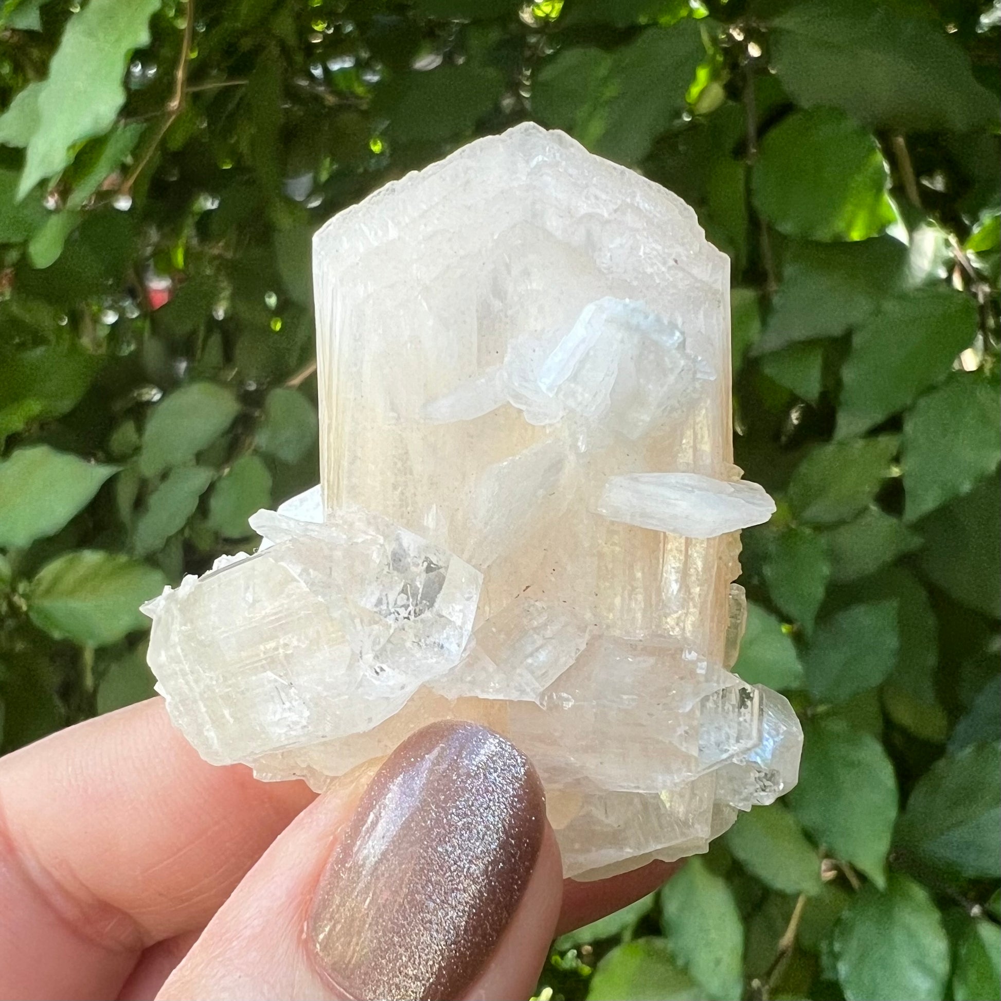 A large, natural Peach Stilbite specimen, beautifully terminated and sitting surrounded by a sweet cluster of smaller Mirror Apophyllite points.Ā This Zeolite specimen is high grade and a stunning addition for any mineral specimen collector.