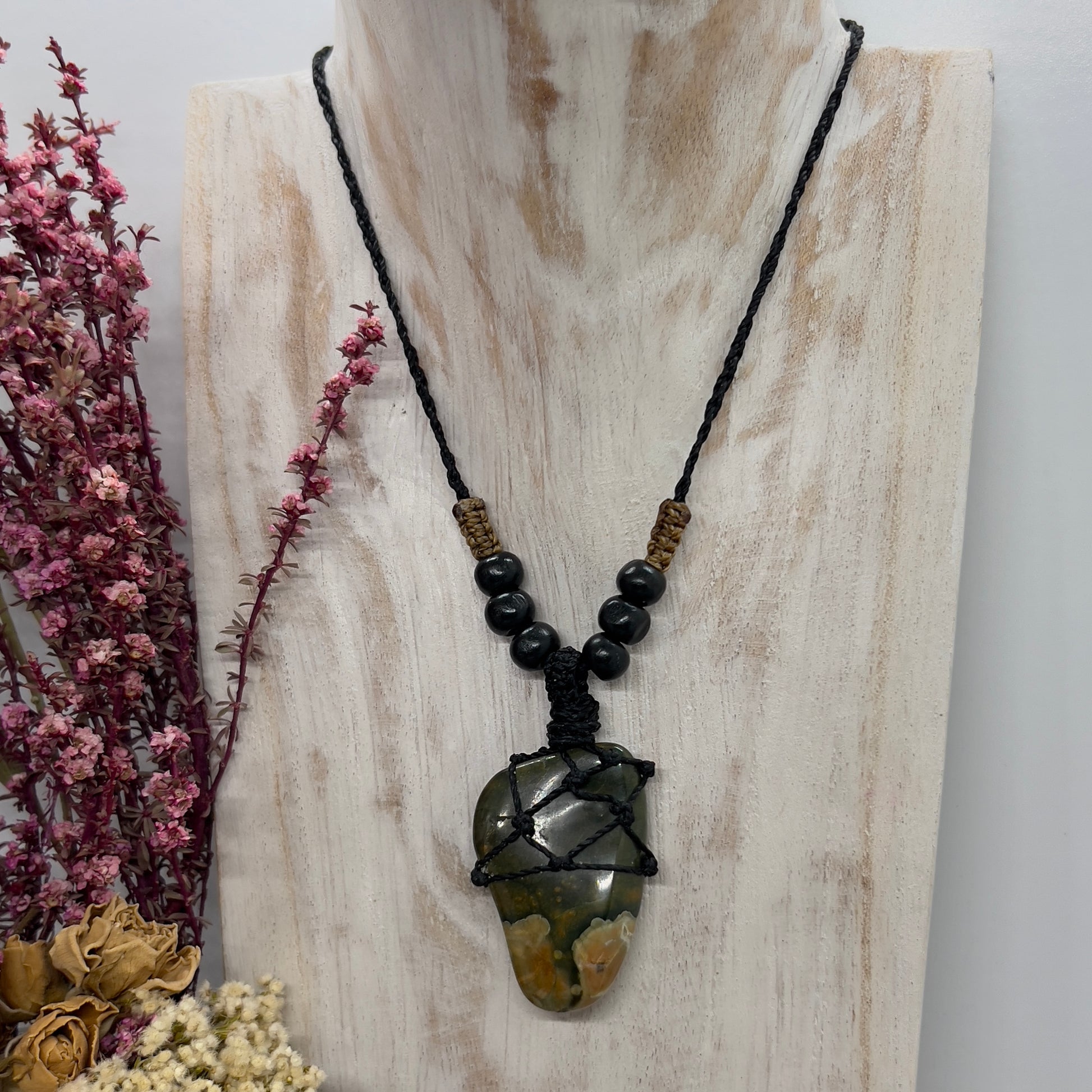 Rhyolite / Rainforest Jasper with Black wood beads on Black 1mm Linhasita cord with caramel tone knotted row.  The cord ends have been finished with polished Jasper beads.
