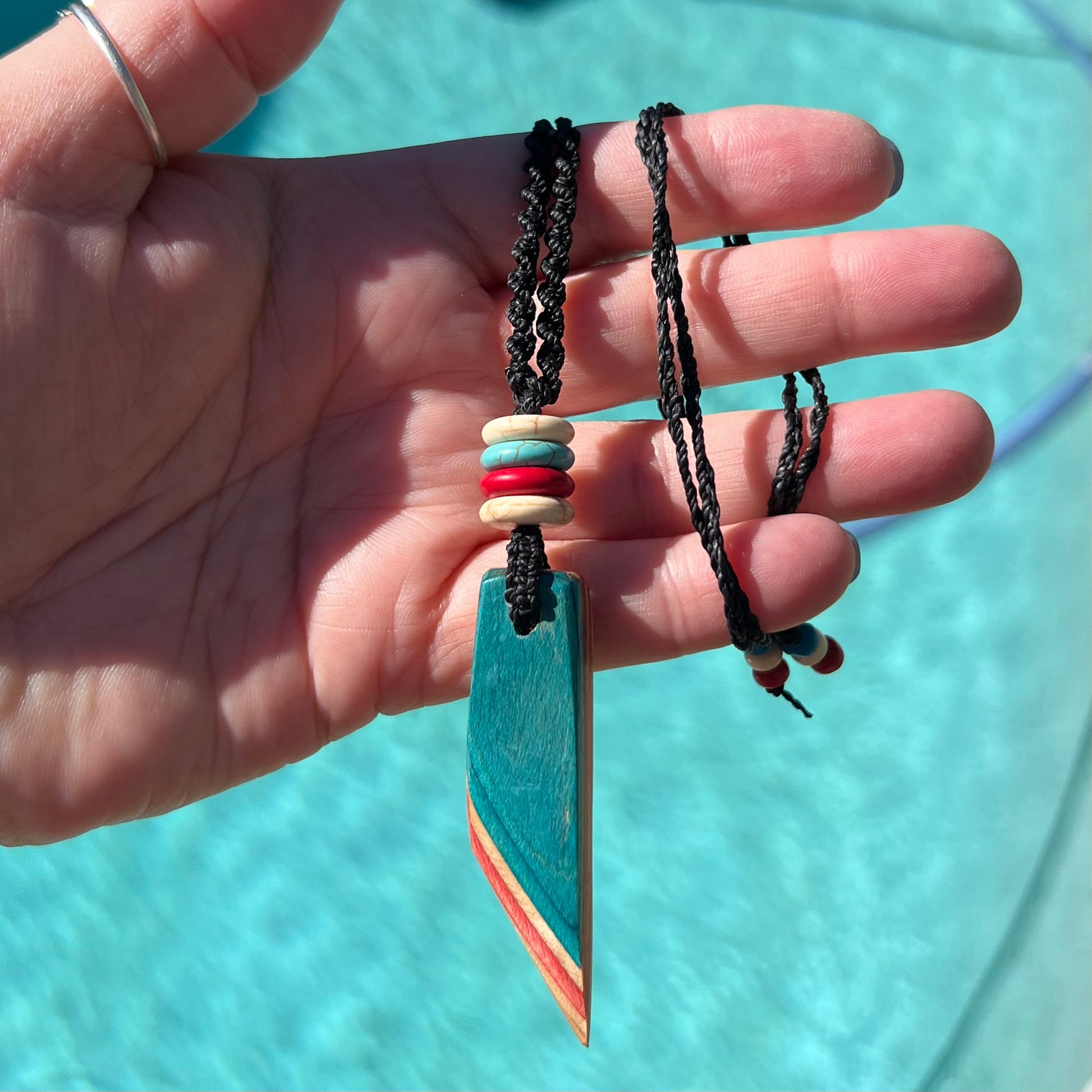 This bold, one-of-a-kind necklace features a hand-shaped Sk8 Rock pendant made from recycled skateboard wood, paired with vibrant dyed magnesite beads. The design is braided into durable, water-resistant Linhasita cord and finished with an adjustable sliding knot for a custom fit. Brightly dyed wood beads at the ends add an extra pop of color and personality.