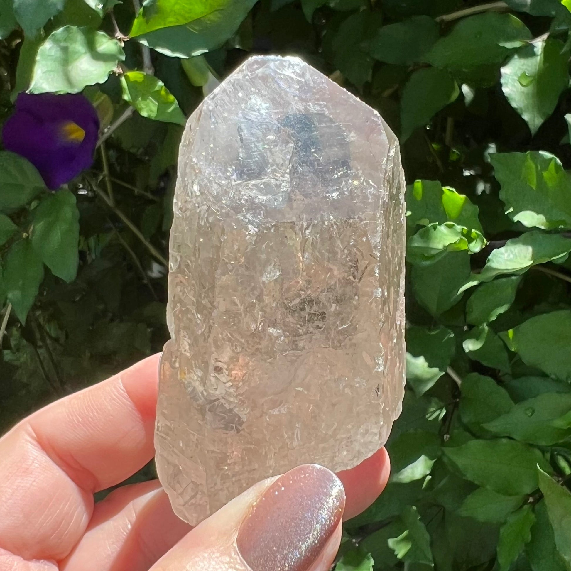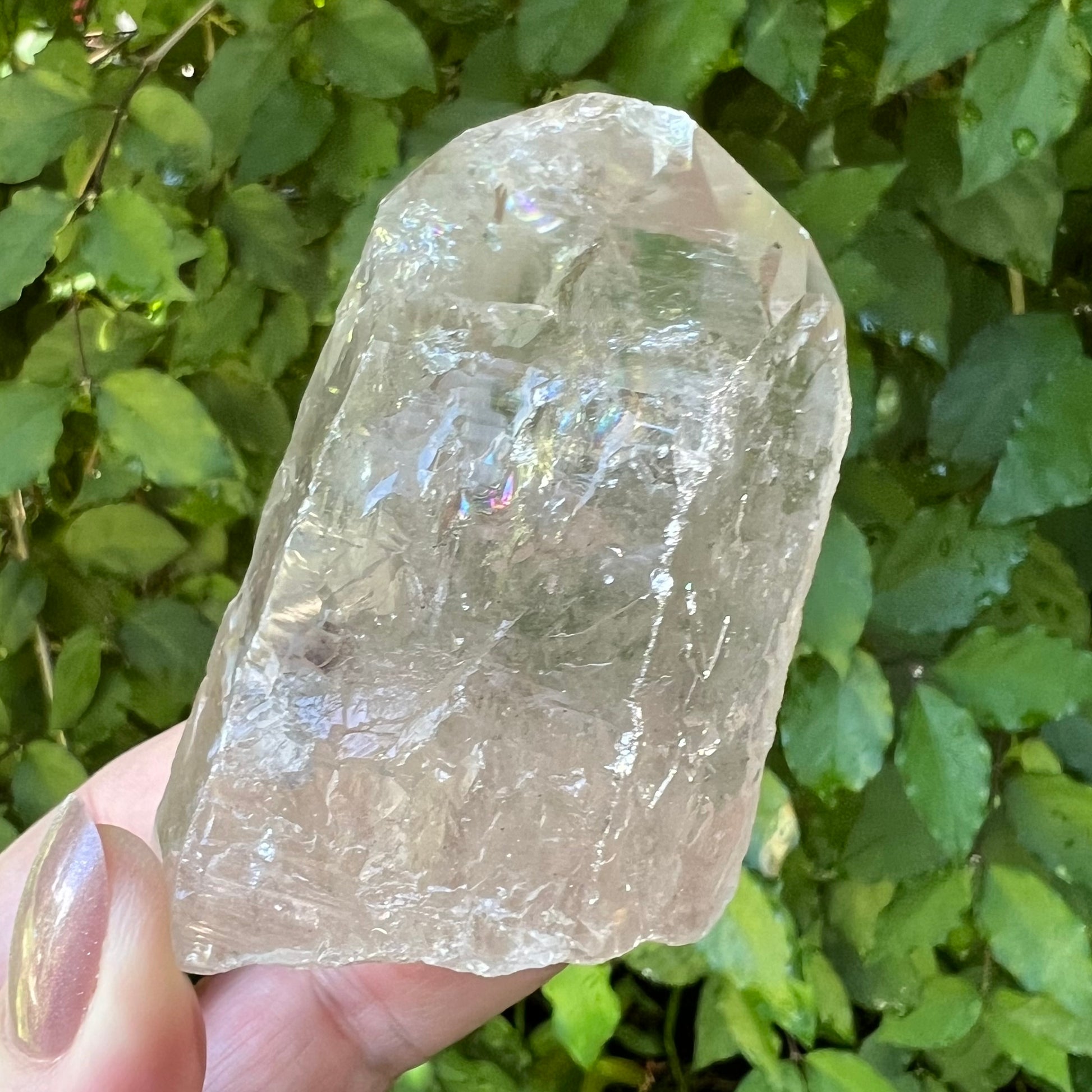 Smoky Quartz is a beautiful crystal and one of the 'essentials' for any crystal worker and collector. This Smoky Quartz point is a large size, perfect to hold in your palm and has a nine sided primary face. She has a minor injury to the side of the tip however this is not a large chip and the small fracture has created a rainbow inside the crystal.
