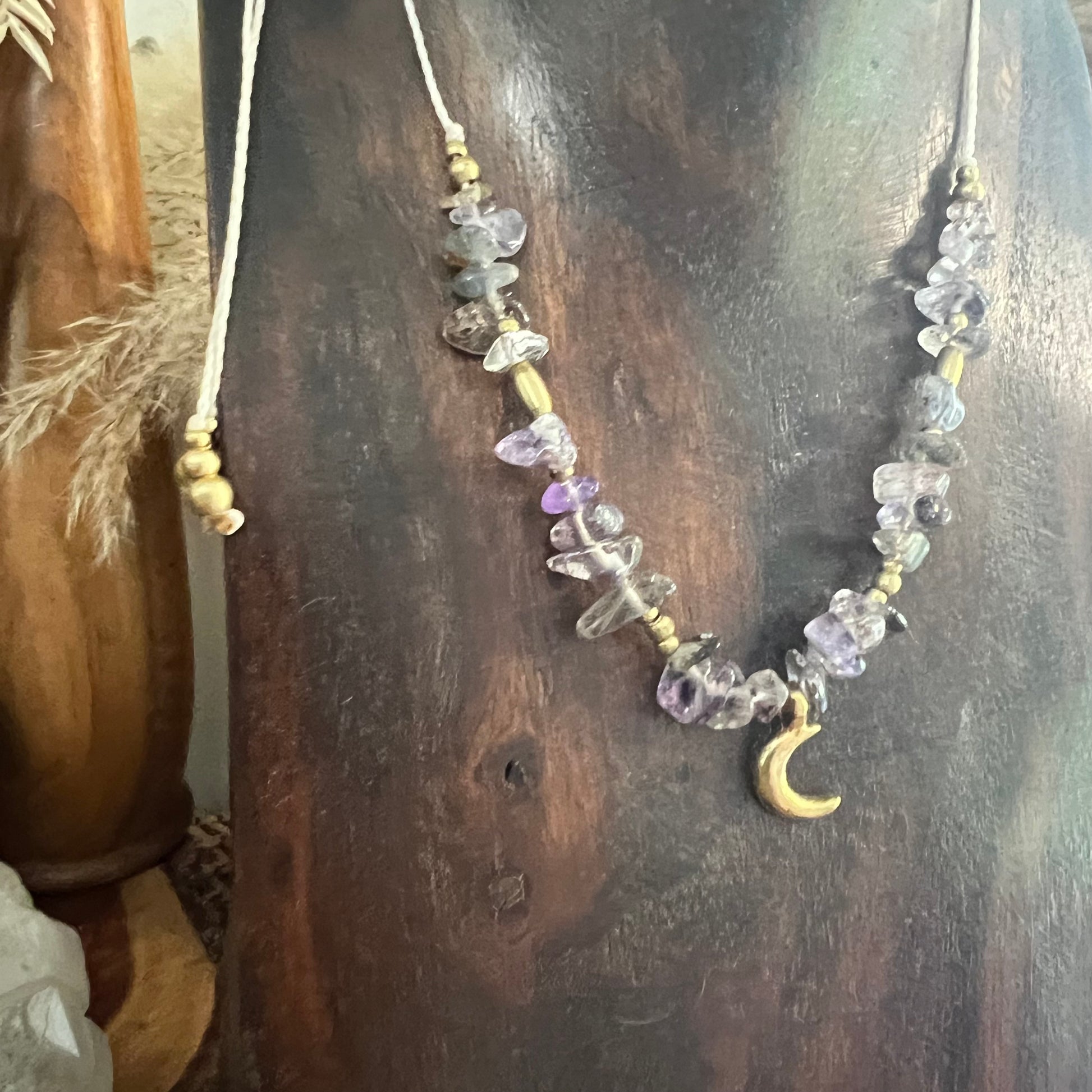 A lush and enchanting necklace featuring beautifully polished, irregular Super Seven Quartz beads—known for their powerful energy and unique blend of seven mineral inclusions. Paired with high-quality brass beads and delicate brass charms, this piece is strung on a slender 1mm sand-tone Linhasita cord, combining natural mystique with elegant metallic accents.