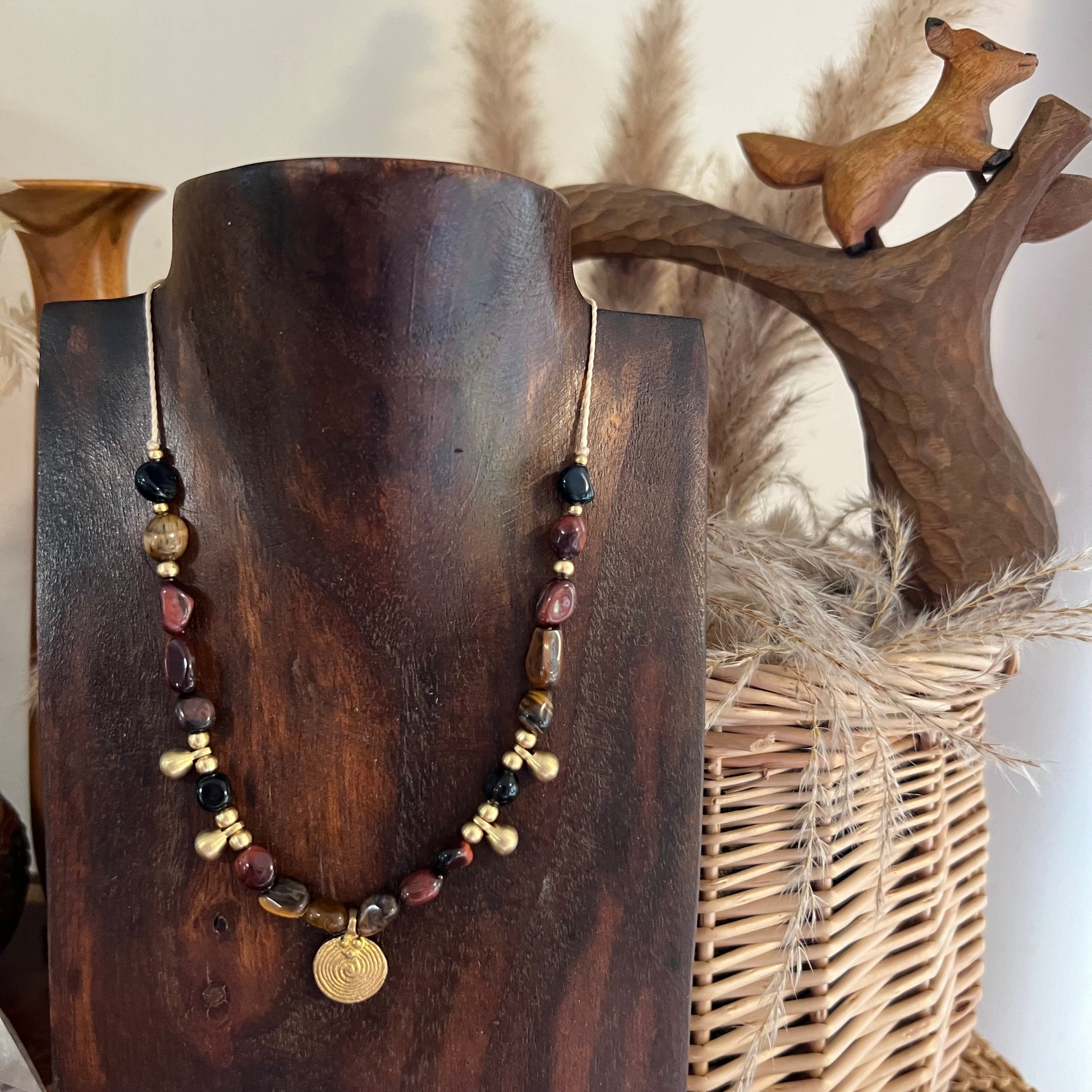 Bring enthusiasm, clarity and strength to your day with this with this beautifully crafted necklace featuring polished free-form Tiger’s Eye beads and accented with high-quality brass beads and charms on durable 1mm sand-tone Linhasita cord - a perfect balance of earthy elegance and boho charm.