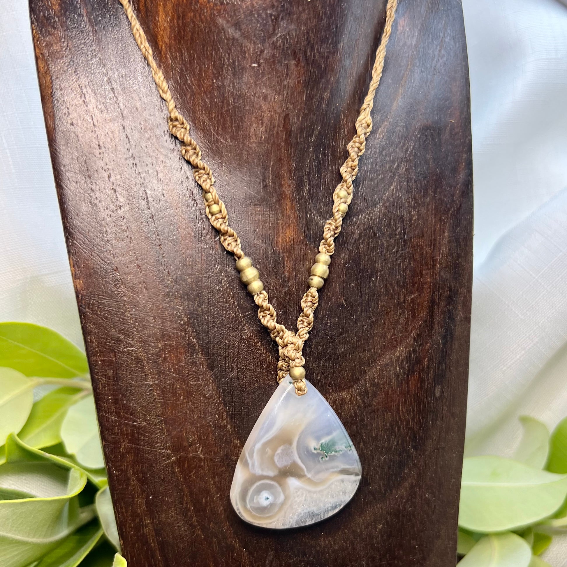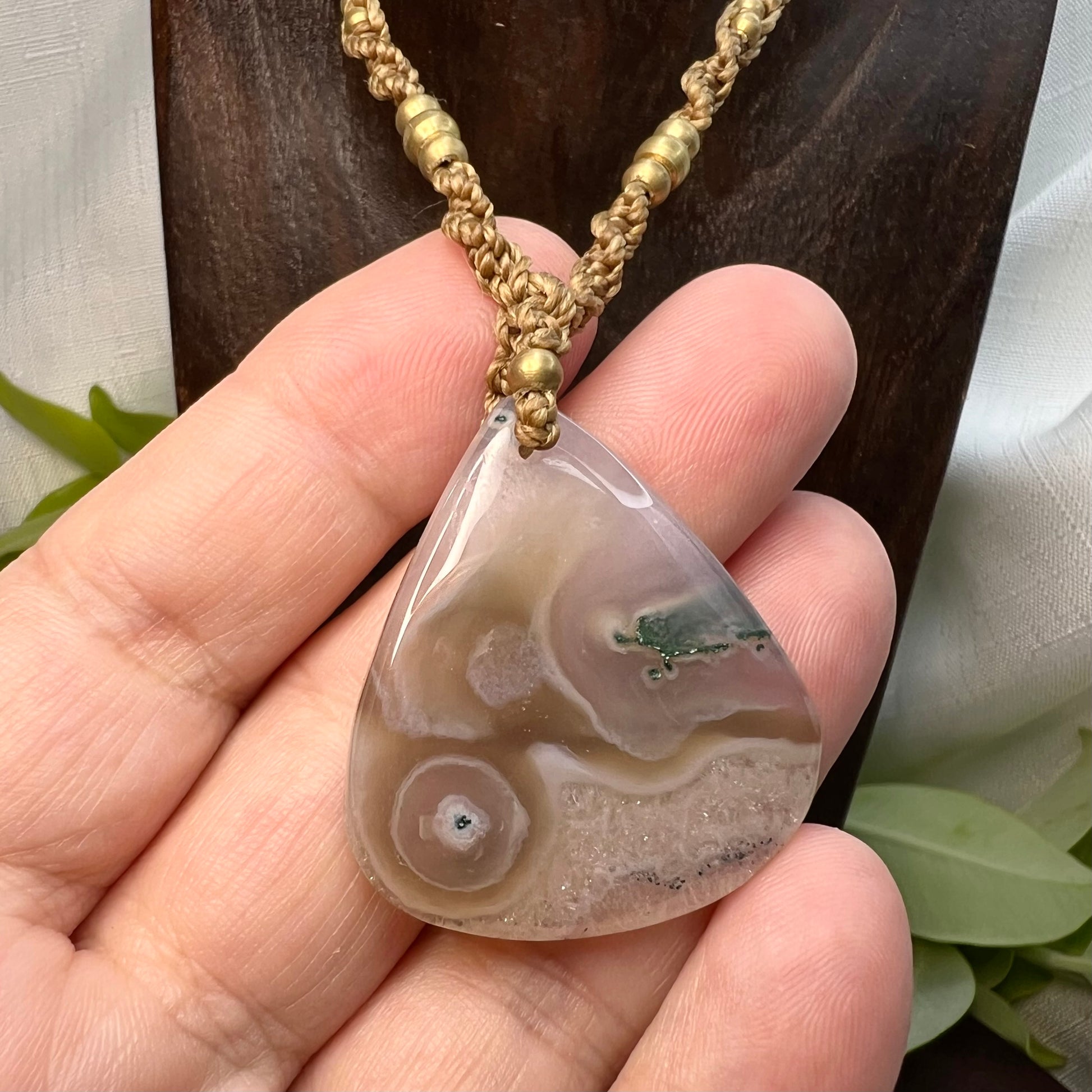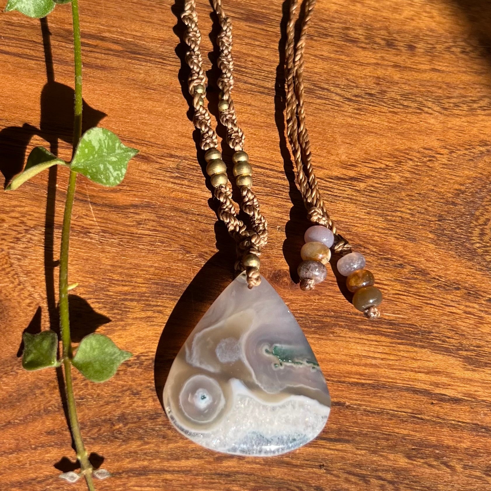 Beautiful and unique, this Moss Agate has sparkling polished druzy section and mossy patterns. Created on 1mm caramel Linhasita cord, accompanied by pretty brass beading and tipped with Rainbow Agate beads.