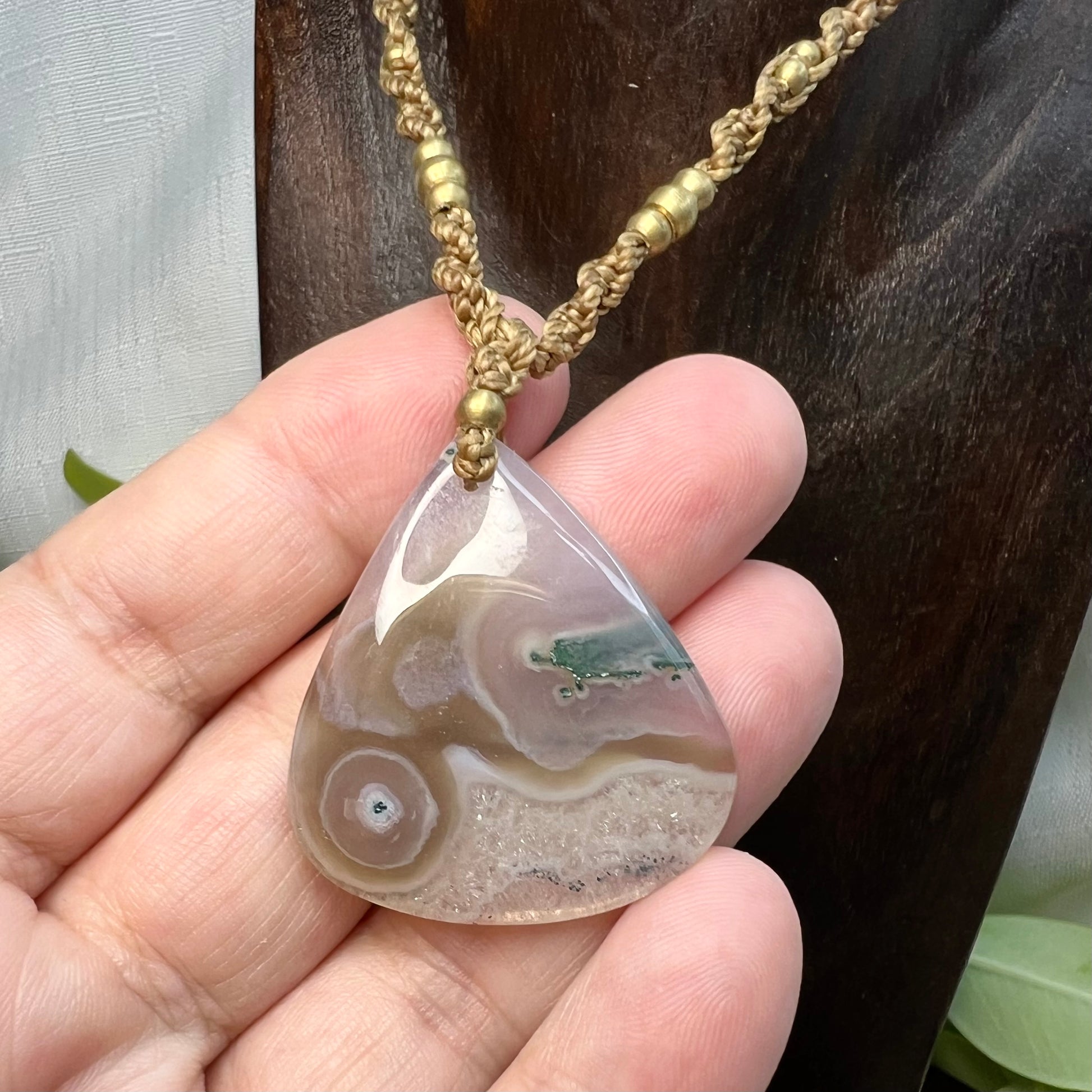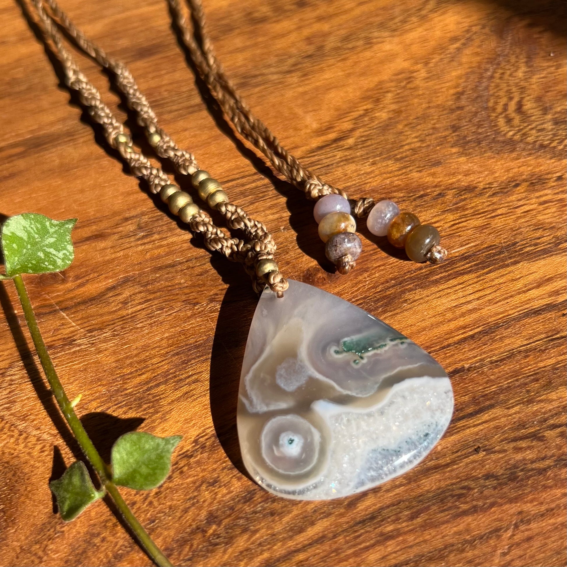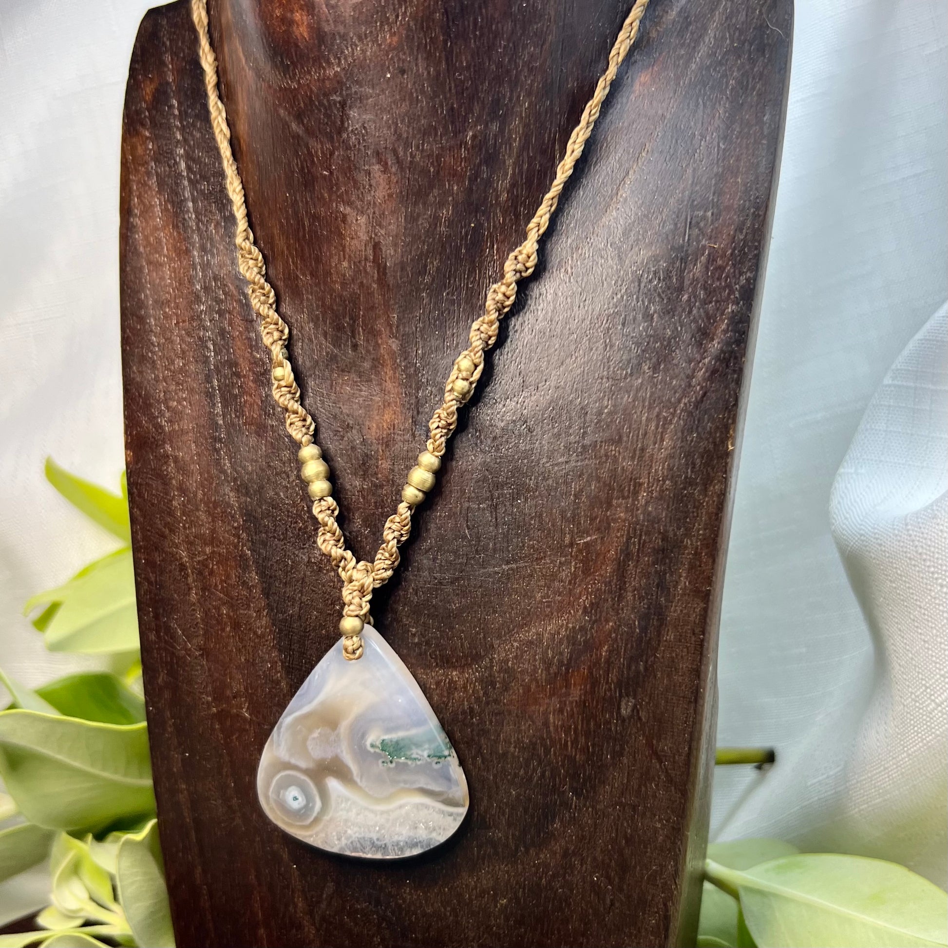 Beautiful and unique, this Moss Agate has sparkling polished druzy section and mossy patterns. Created on 1mm caramel Linhasita cord, accompanied by pretty brass beading and tipped with Rainbow Agate beads.